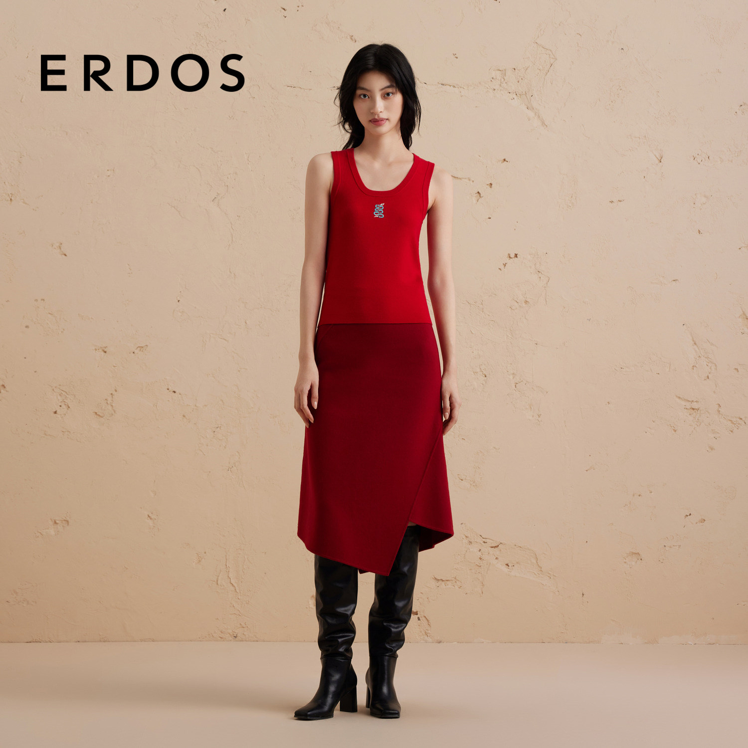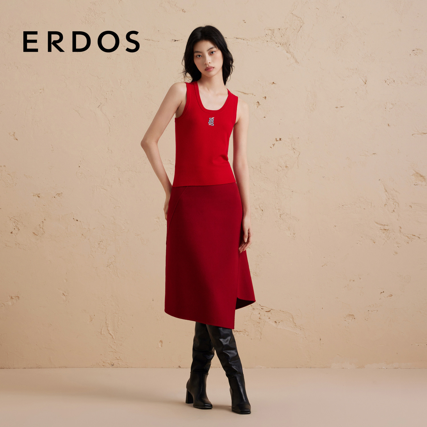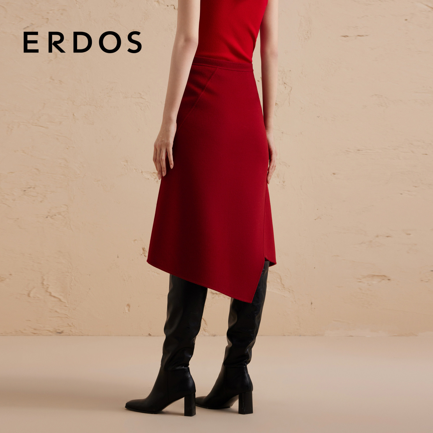 【礼物系列】ERDOS红色羊毛半身裙女冬不规则双面毛呢A字裙