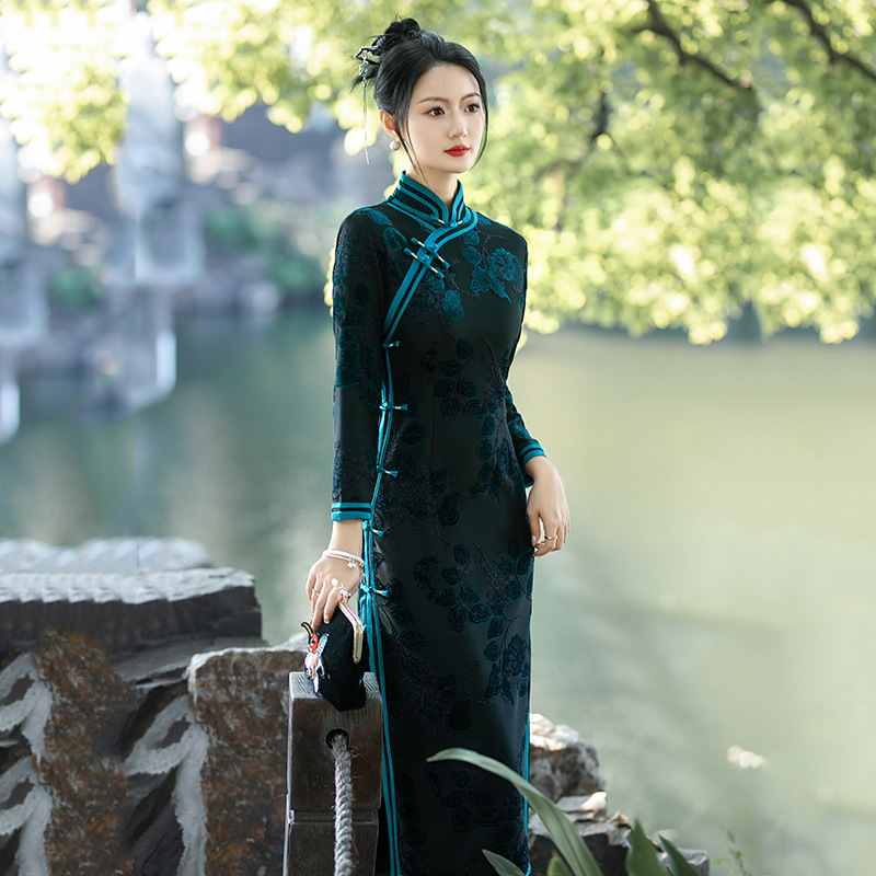 秋冬新款气质优雅彩金植绒旗袍加绒加厚高端妈妈改良版旗袍连衣裙