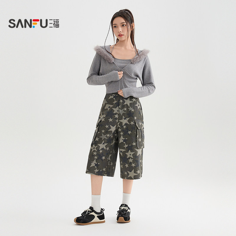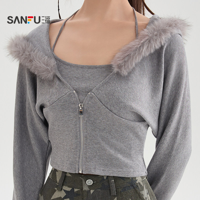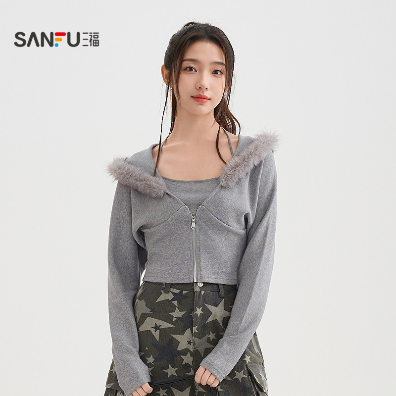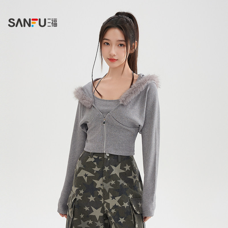 三福灰色卫衣2026春季挂脖吊带连帽毛领外套两件套上衣女装520728