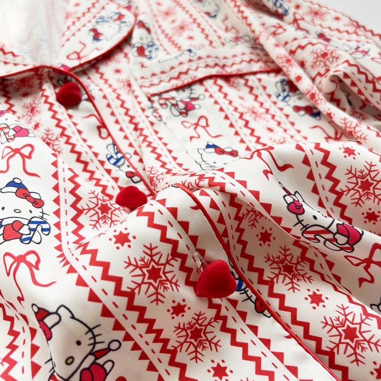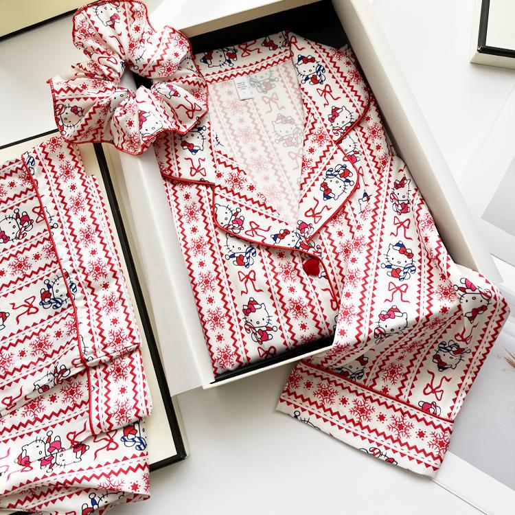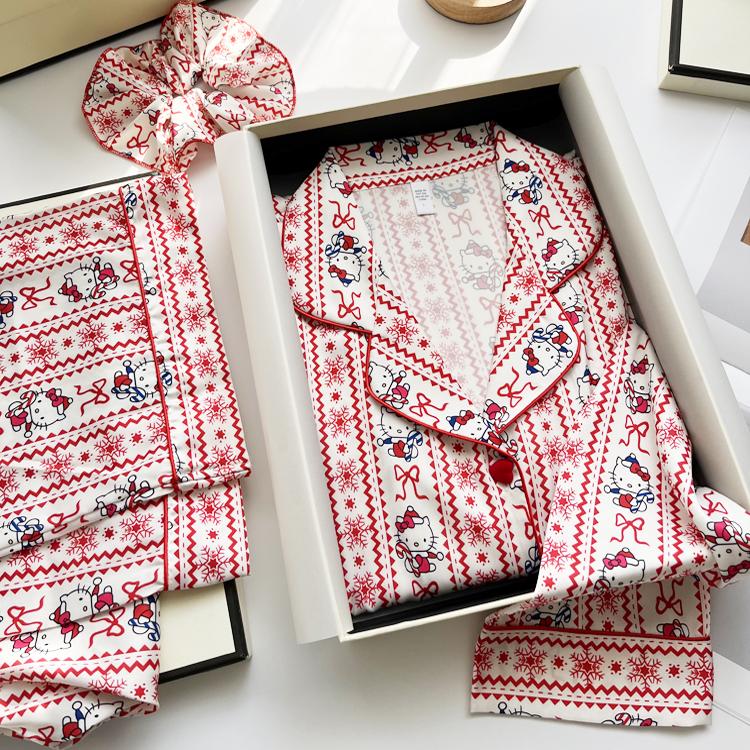 本命年红色卡通kitty猫咪冰丝绸睡衣女春季送闺蜜朋友礼盒家居服
