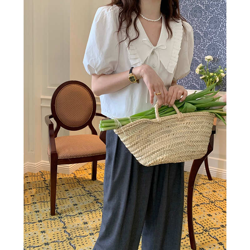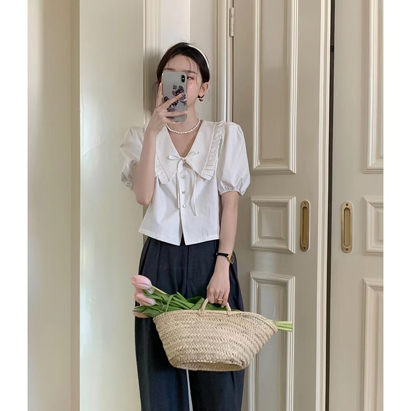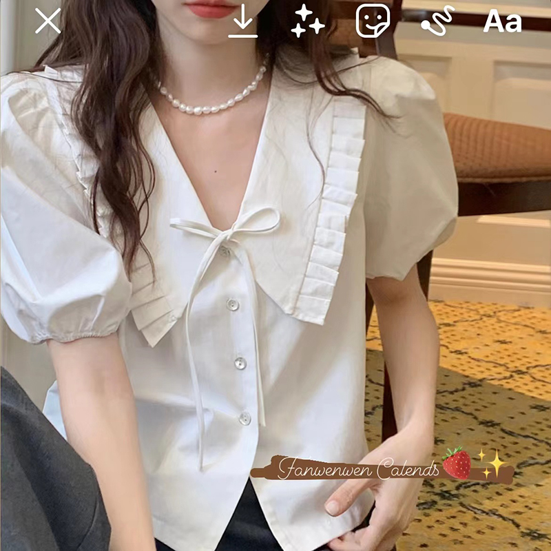 范雯雯 奶油浓汤 法式复古百褶娃娃领公主泡泡袖白衬衫短款上衣女