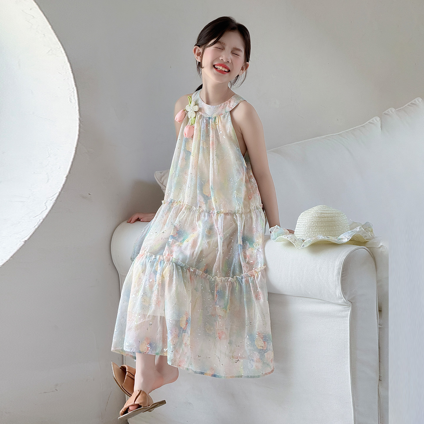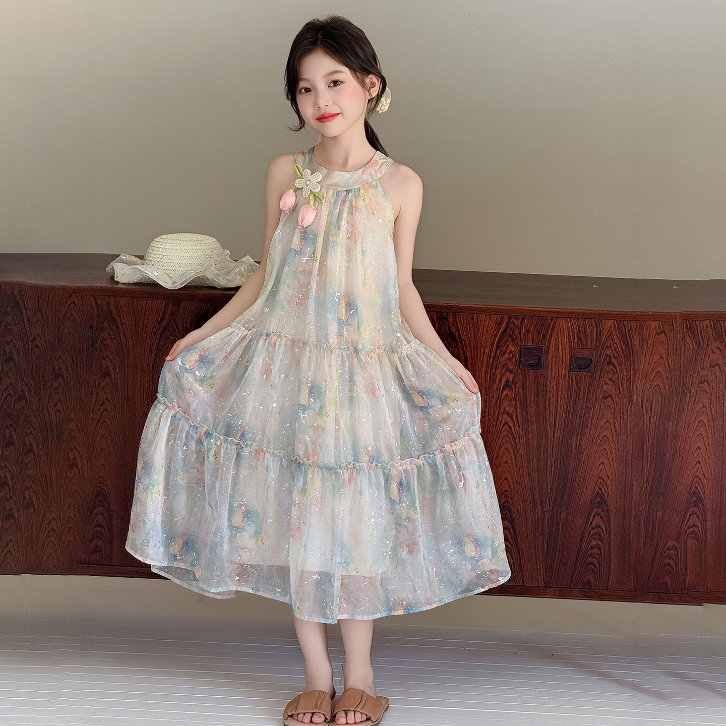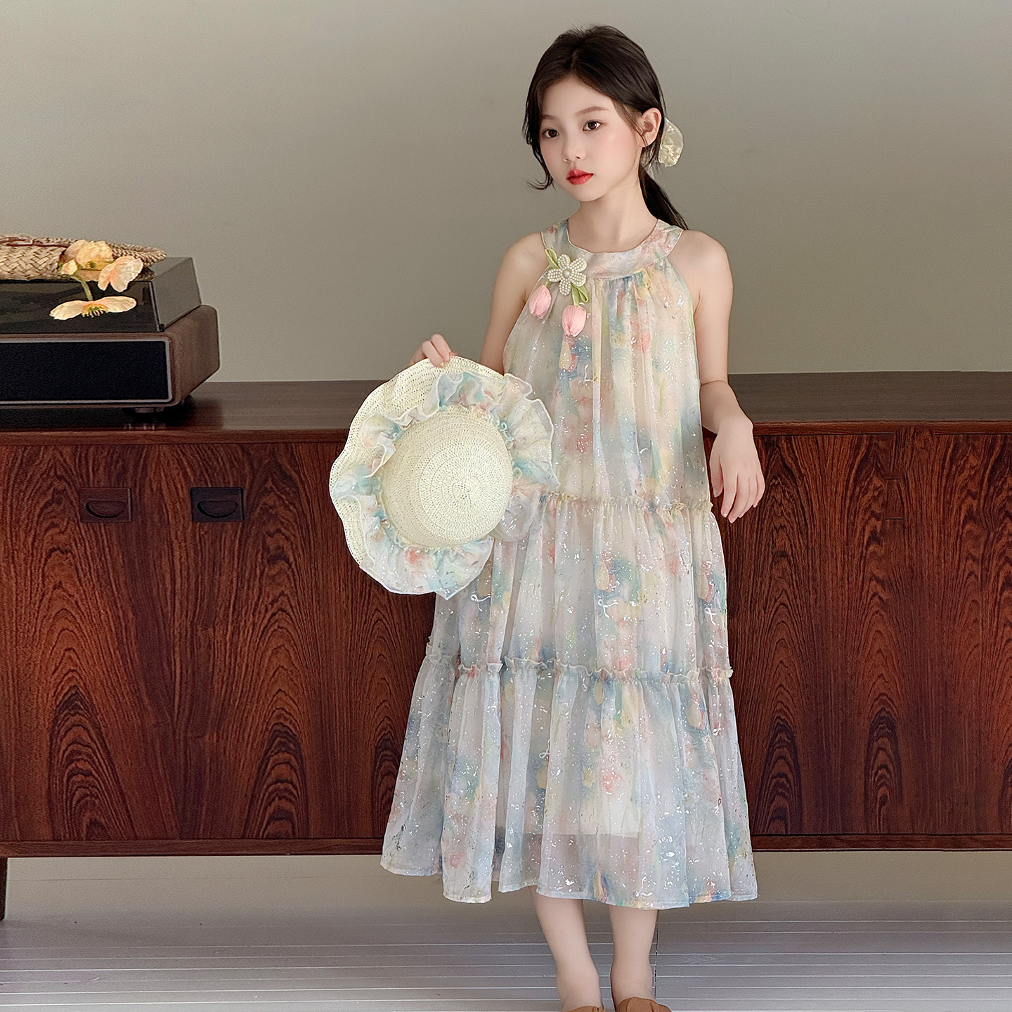 女童夏季无袖连衣裙2025新款洋气女大童挂脖碎花沙滩裙夏款公主裙