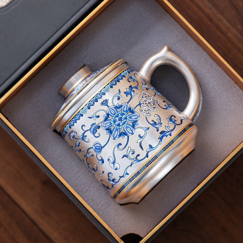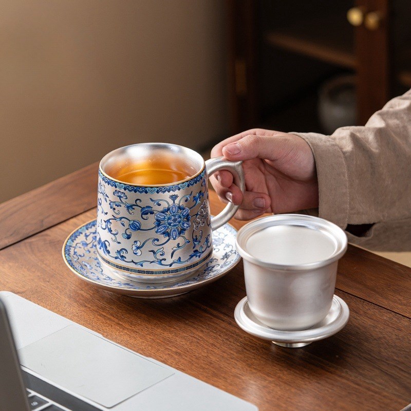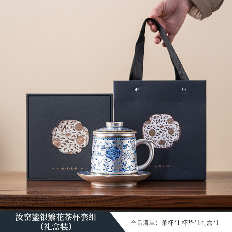 缠枝莲汝窑鎏银办公杯茶杯陶瓷茶水分离带盖过滤高颜值泡茶器礼盒