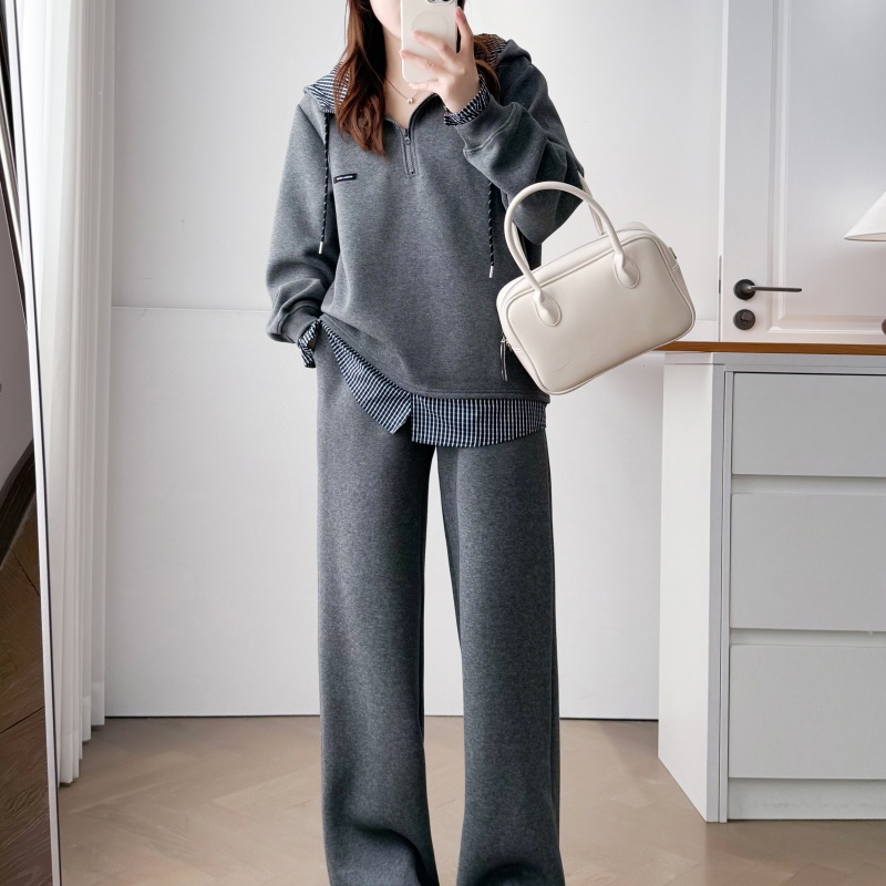 秋季女装新款休闲运动套装大码假两件连帽格纹拼接卫衣阔腿裤套装