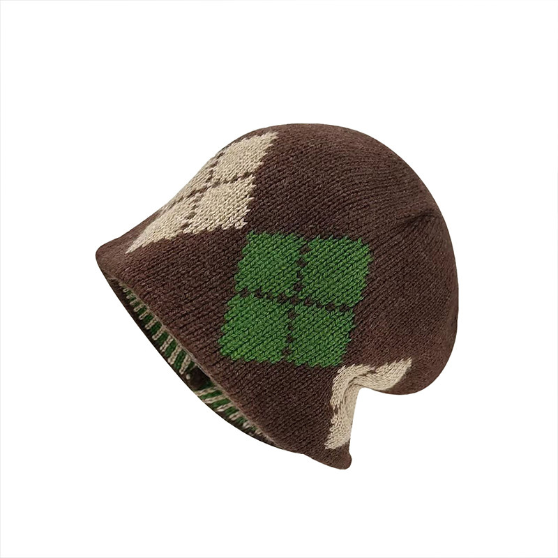 韩系ins时尚菱形格拼色针织帽女秋冬季复古休闲百搭显脸小包头帽
