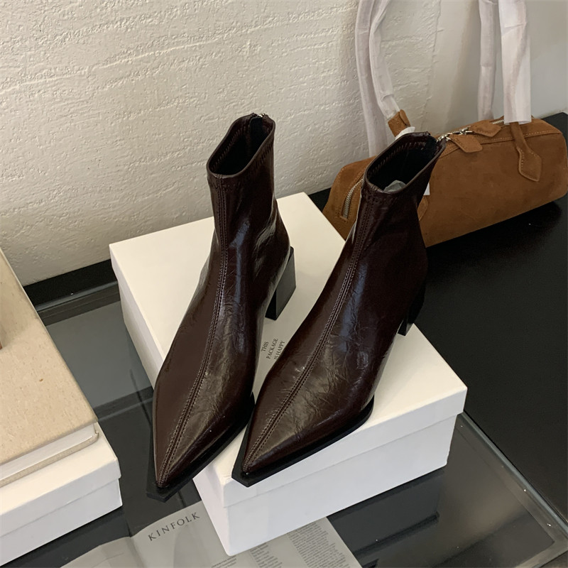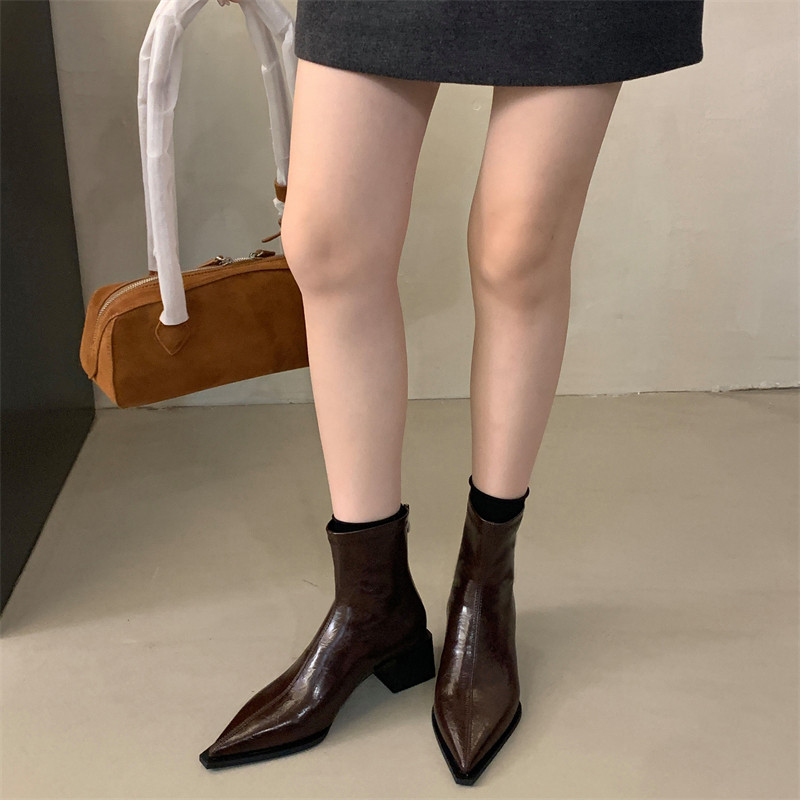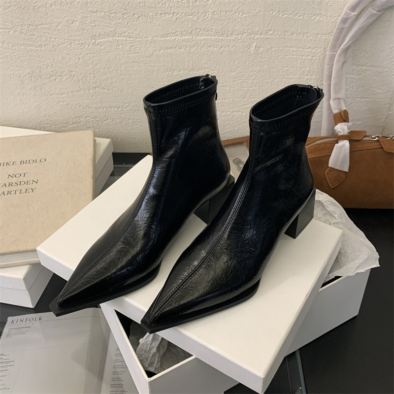 尖头短靴女粗跟百搭仙女2025新款小个子增高瘦瘦靴软皮中跟马丁靴