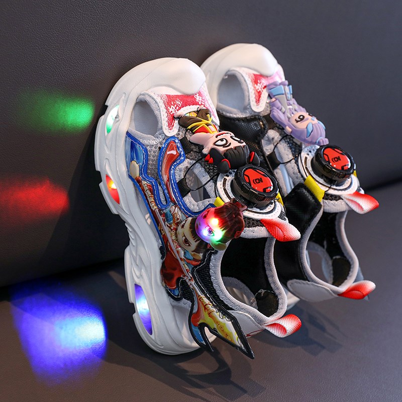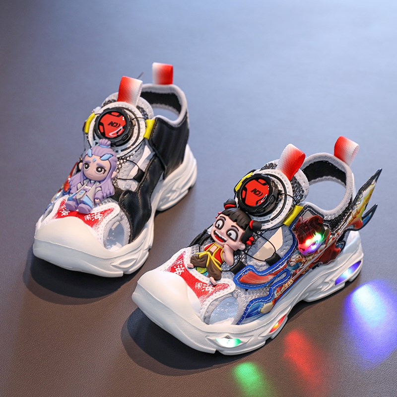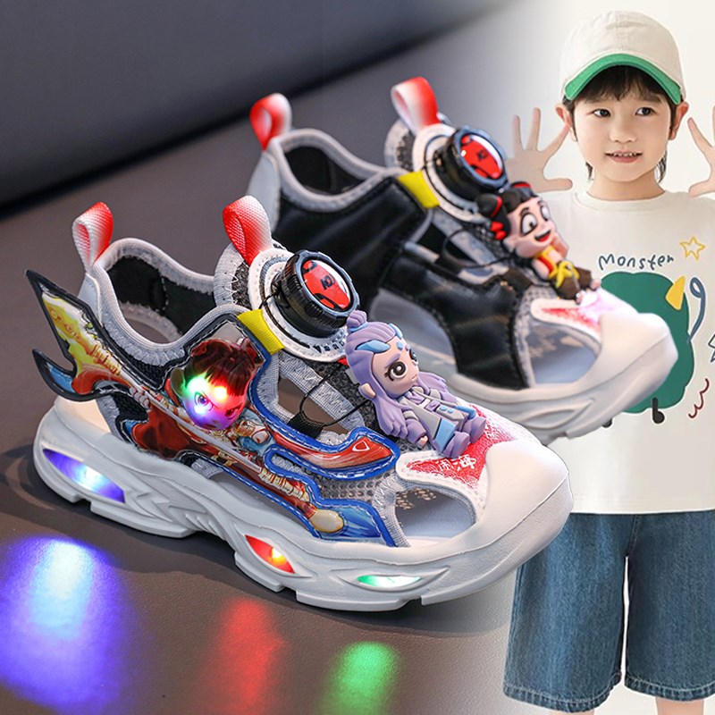 儿童凉鞋男童鞋2025夏季新款哪吒包头运动凉拖男孩亮灯镂空沙滩鞋