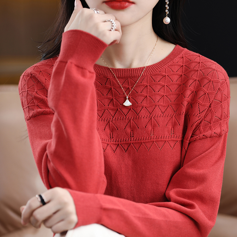 100%纯棉麻毛衫女时尚圆领针织打底衫大码妈妈装宽松长袖毛衣减龄