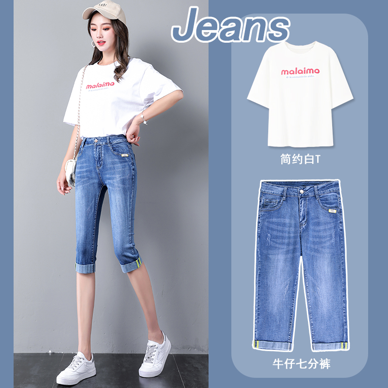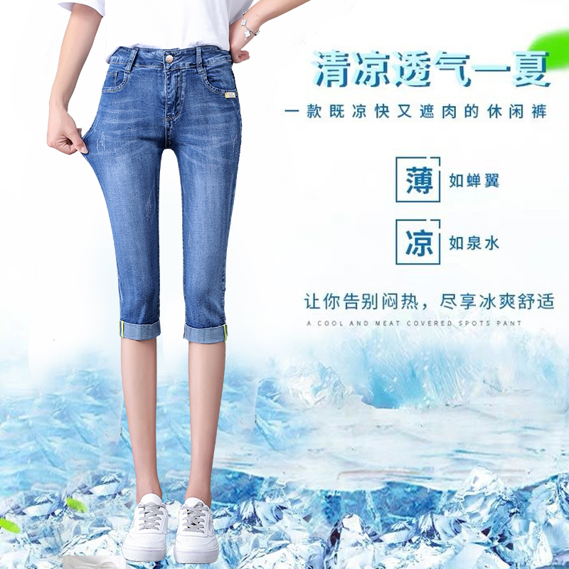 七分牛仔裤女夏季薄款胖mm大码小个子显K瘦弹力修身小脚裤中裤短