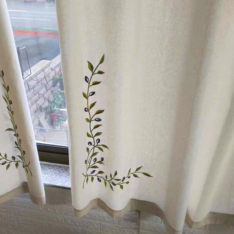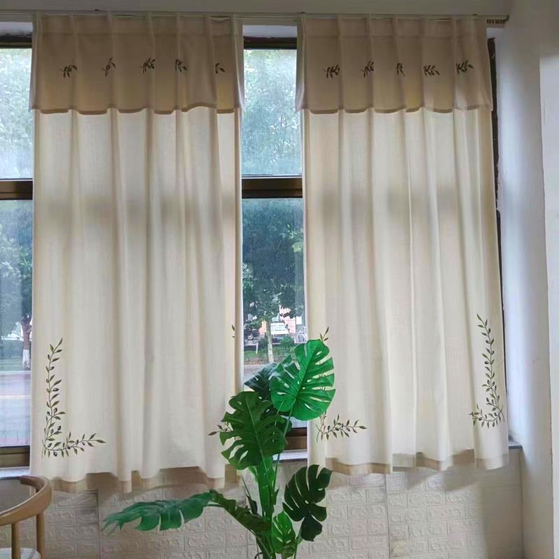 米色棉麻亚麻绣花窗帘窗幔客厅阳台飘窗半遮光透光不透人挂钩穿杆