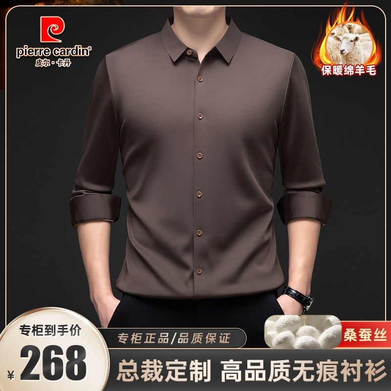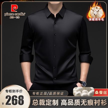 皮尔卡丹桑蚕丝+羊毛长袖衬衫男士加绒加厚2025新款中年男装衬衣