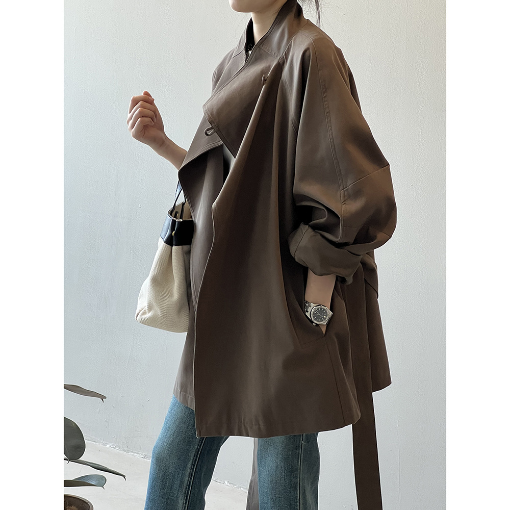 卡其色立领风衣外套女英伦风春秋季休闲茧型小个子中长款收腰大衣