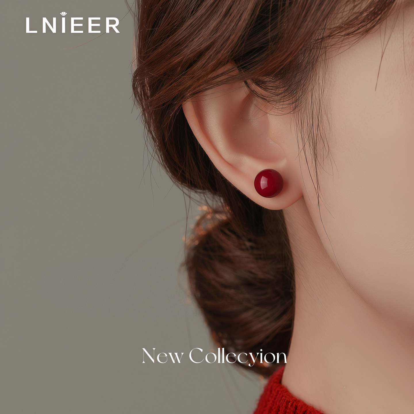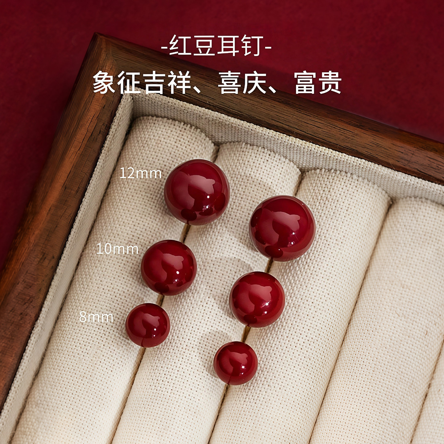 S925纯银红色红豆珍珠耳钉女新年本命年2026马年耳环过年礼物耳饰