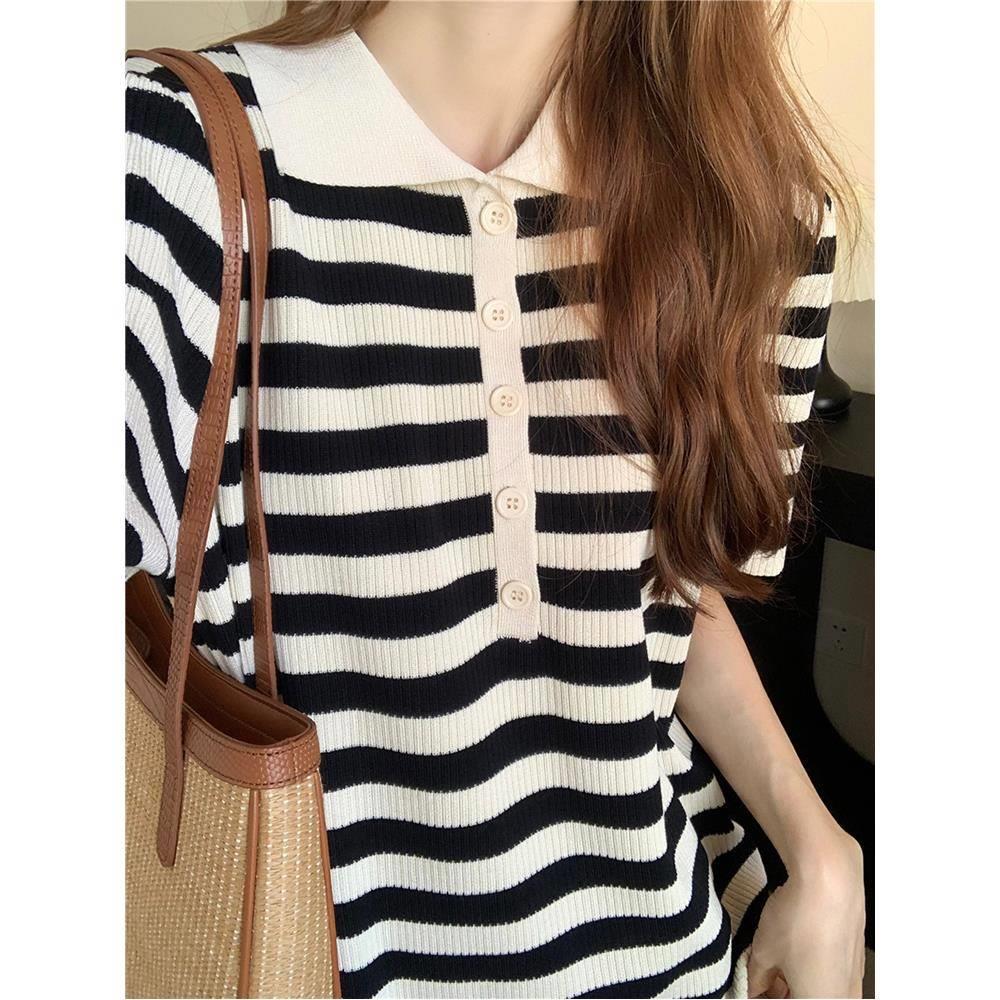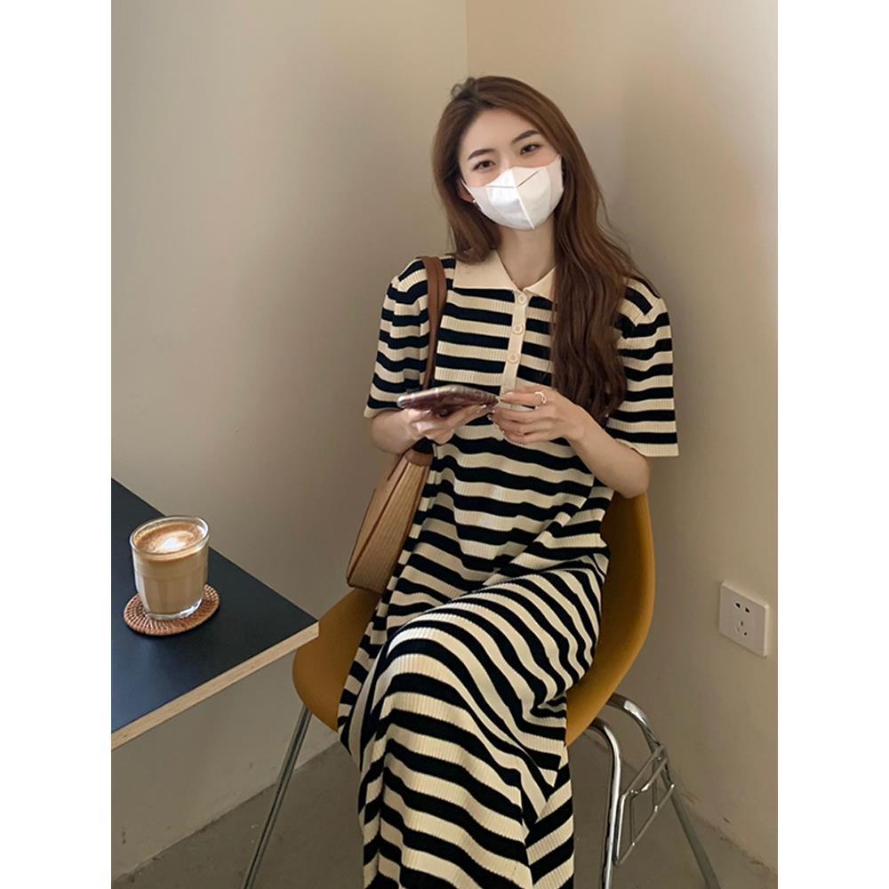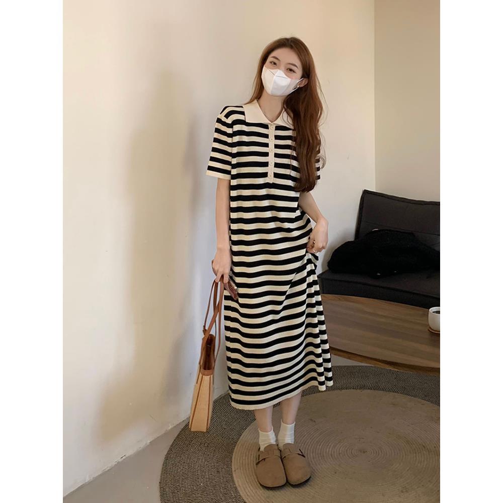 胖妹妹条纹polo衫连衣裙女夏季新款宽松设计感小众长款短袖T恤裙