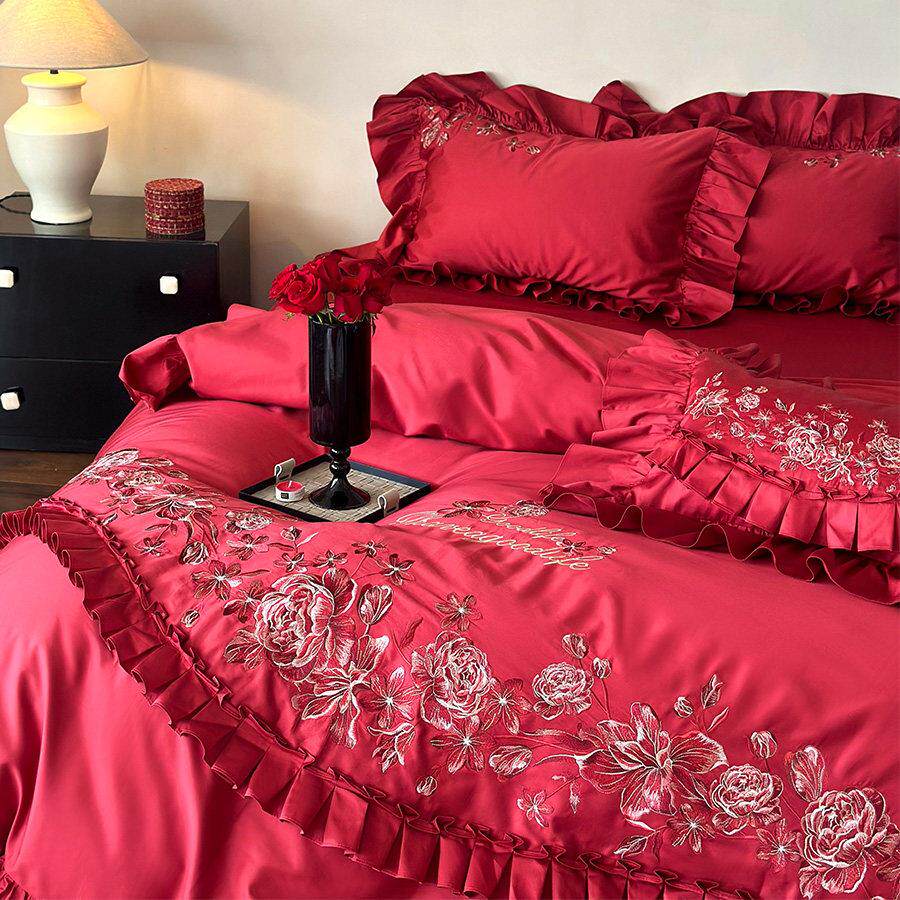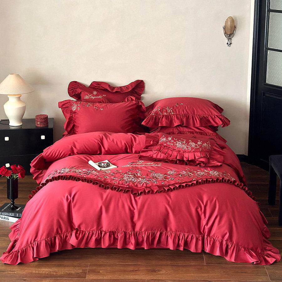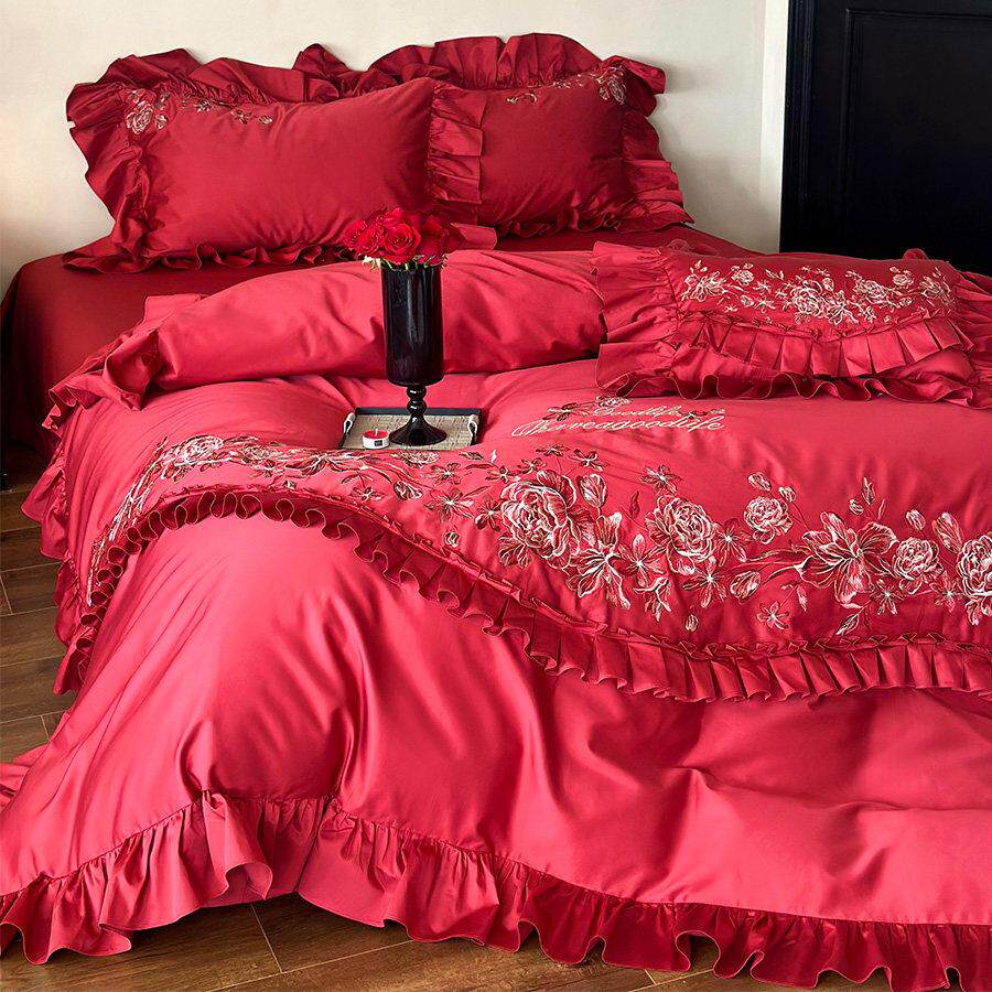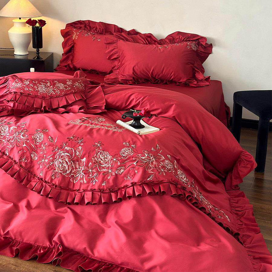 法式浪漫绣花婚庆四件组全棉玫瑰刺绣红色花边结婚被套床单床笠款