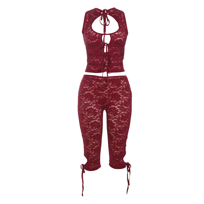 WEIRD PUSS 微醺亚裔辣妹系带镂空无袖上衣女 修身提花裤子套装潮