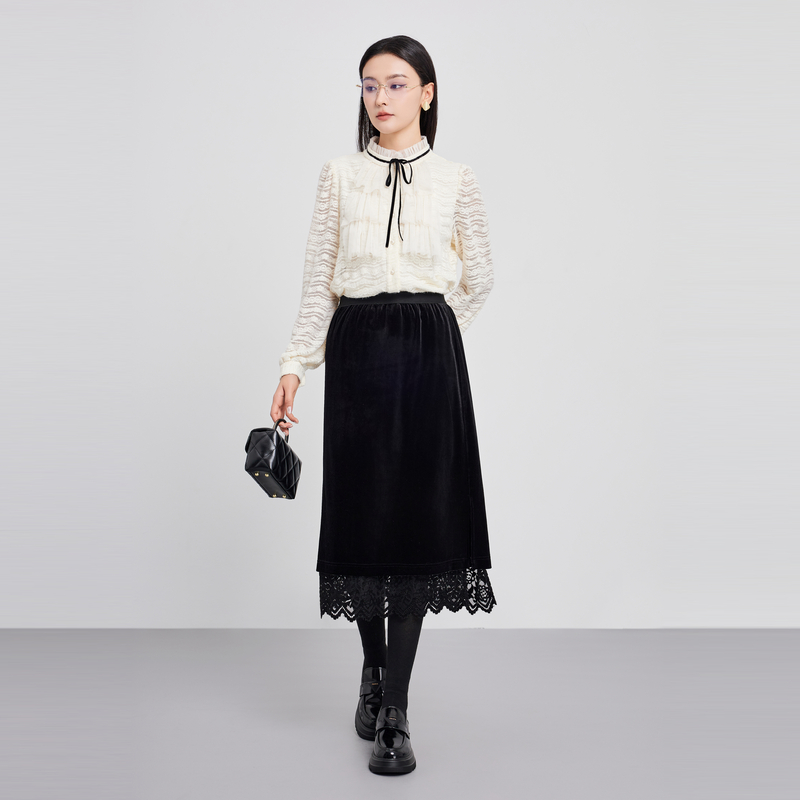 鲁思蒂磨毛蕾丝长袖衬衫2024新款女秋冬季设计感小众时尚打底上衣