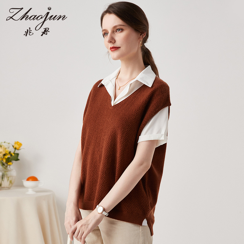 兆君秋冬新款V领落肩羊绒背心女纯色内搭休闲保暖打底针织衫