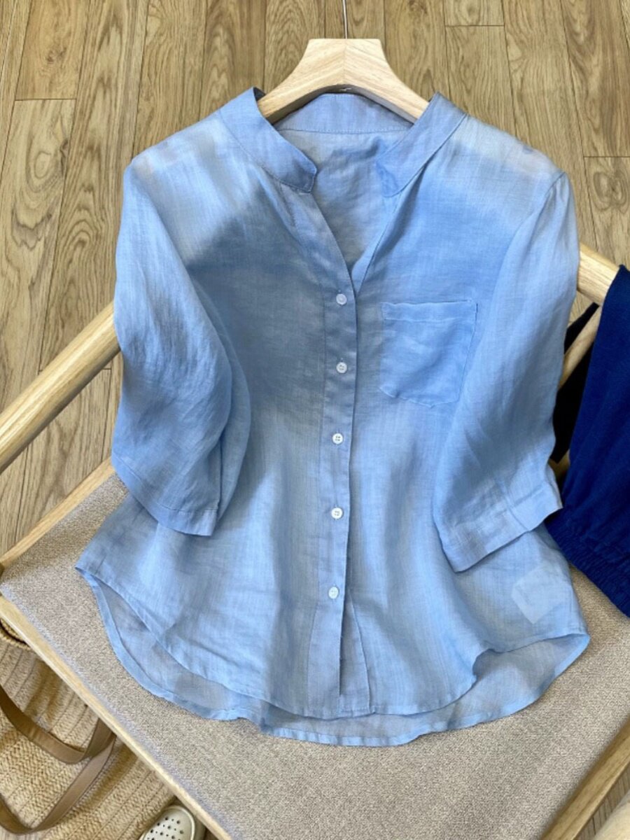 品牌折扣专柜外贸女装简约舒适天丝亚麻轻薄蓝色五分袖衬衫女夏季