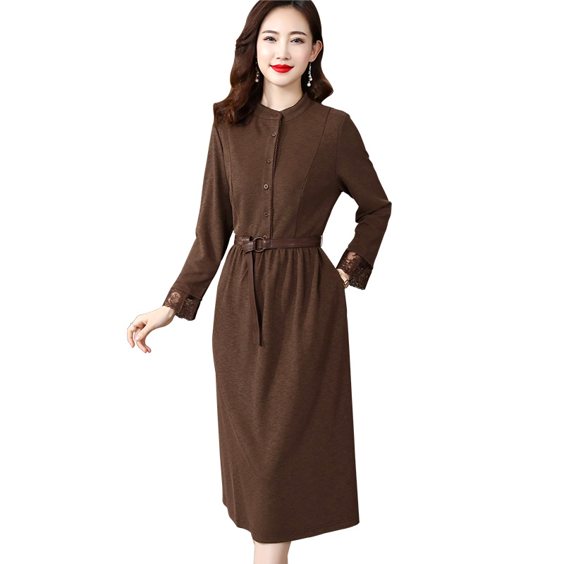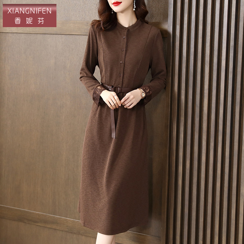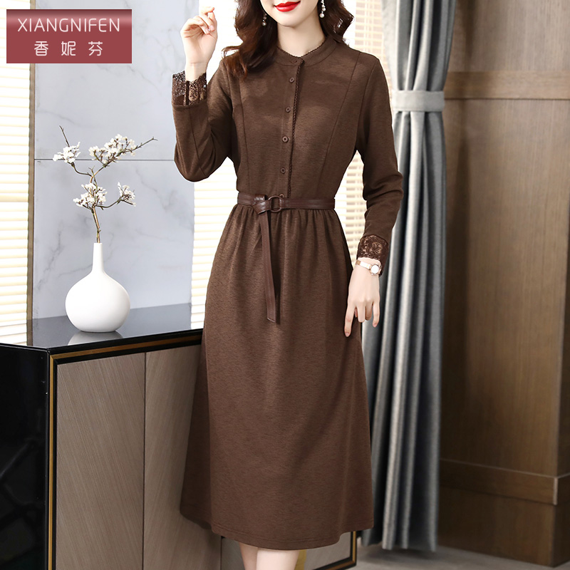 香妮芬法式复古系带收腰妈妈连衣裙女2025新款棕色气质高级感长袖