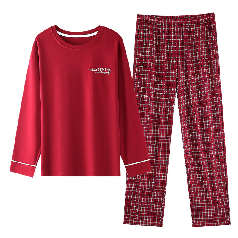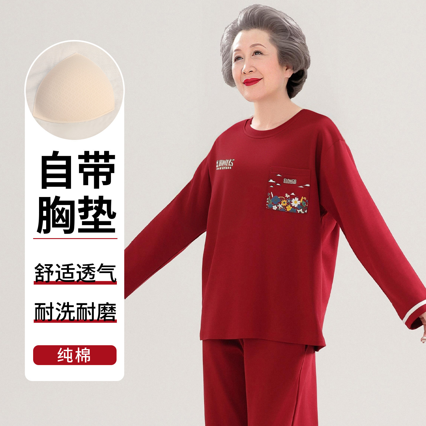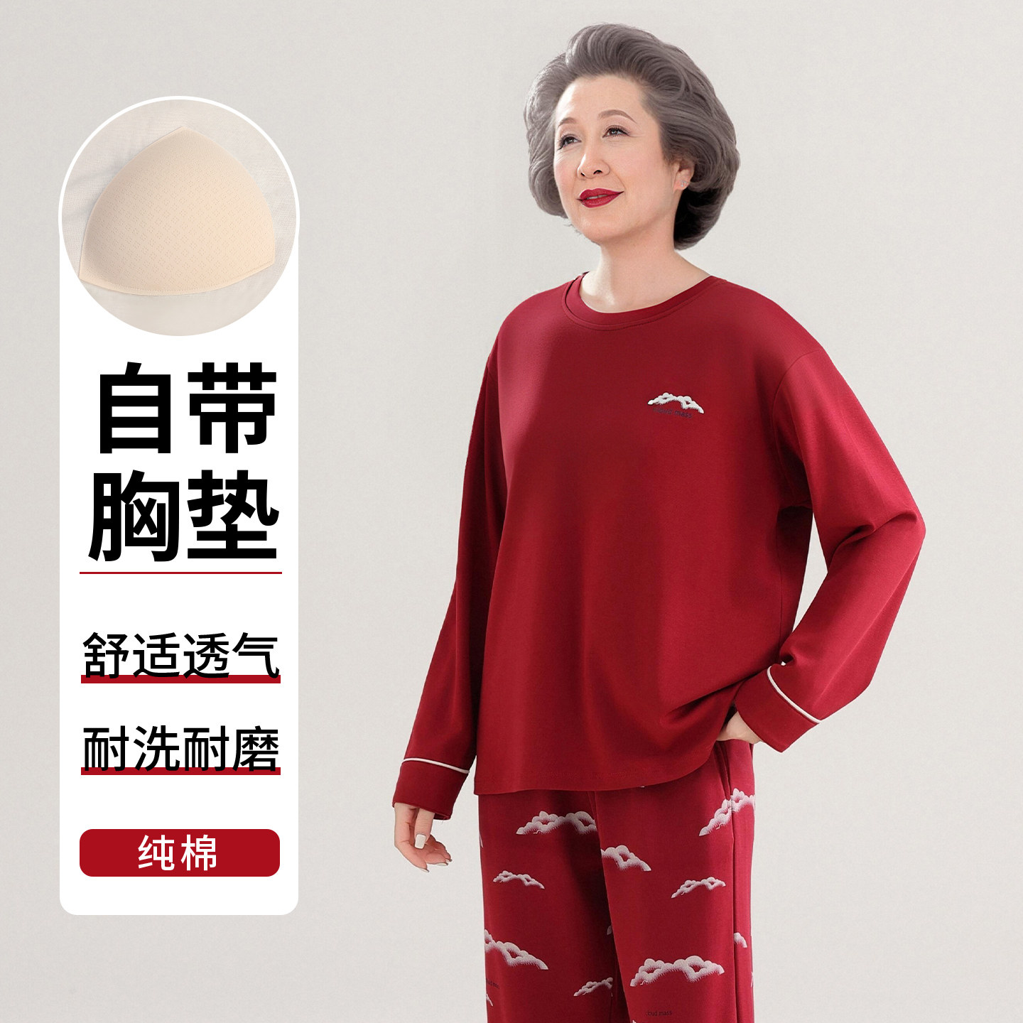 猫人带胸垫妈妈睡衣女春秋纯棉长袖红色本命年中老年人婆婆家居服