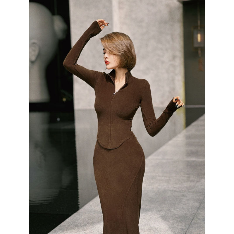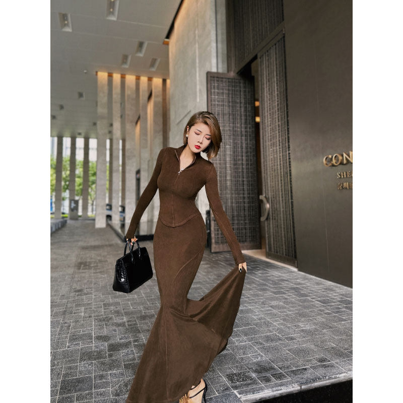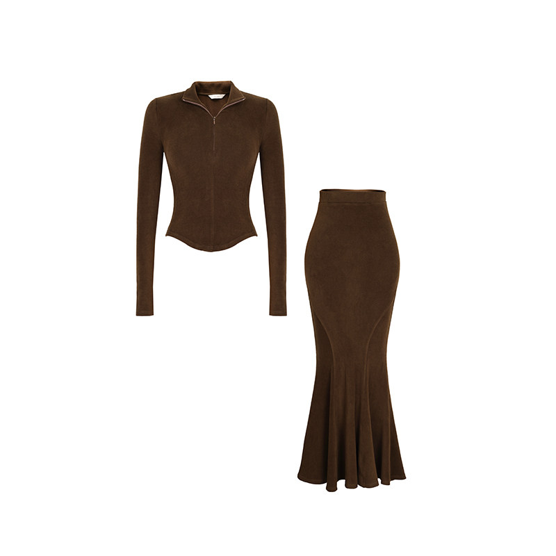 XULU原创简约慕斯绒气质polo领长袖上衣高腰鱼尾半身裙两件套装