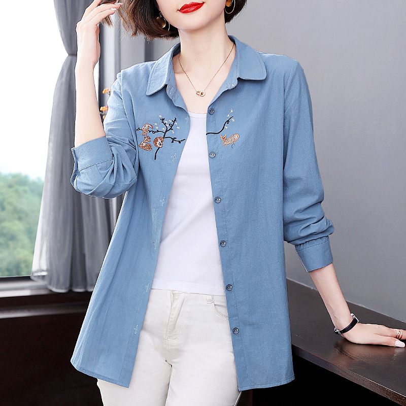 纯棉衬衫女装2024春秋新款百搭妈妈长袖上衣大码女士显瘦衬衣外套