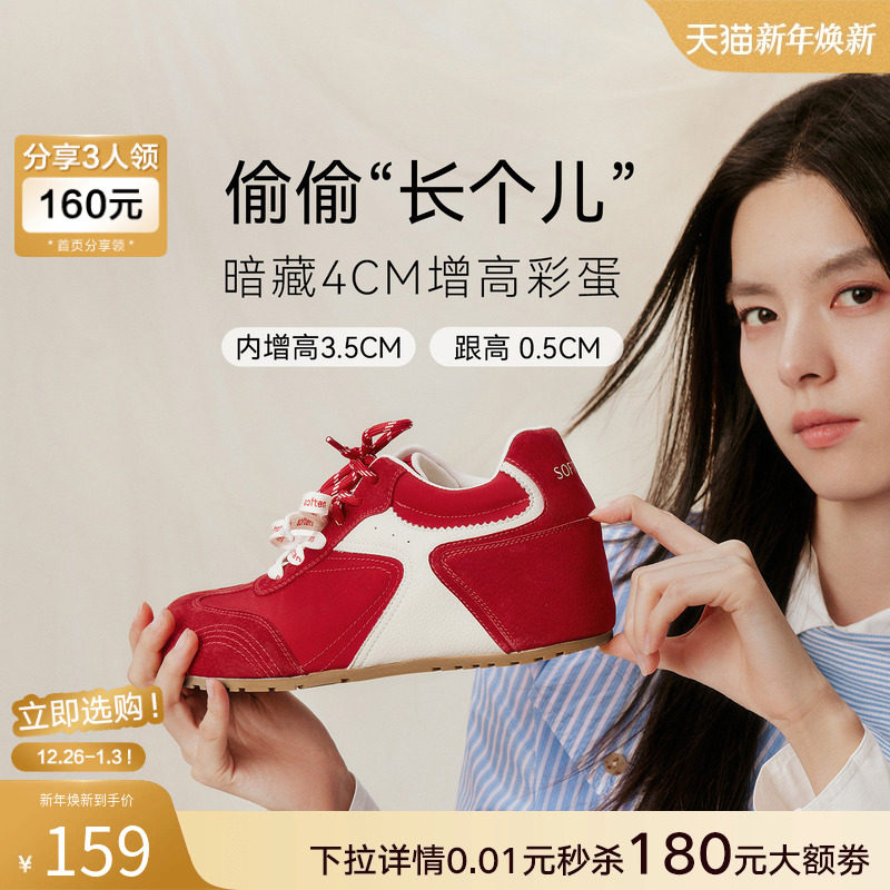 【小番茄】百思图25秋新款红色德训鞋内增高女厚底运动休闲鞋女鞋