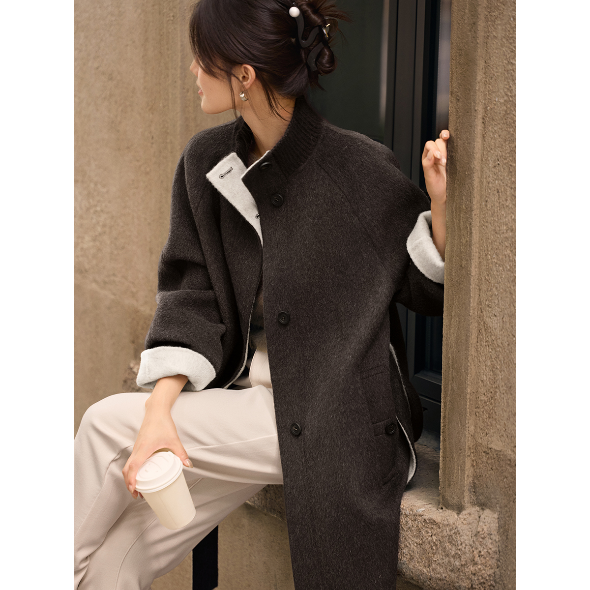 XWI欣未双面双色针织拼接100%绵羊毛大衣女冬季轻盈保暖毛呢外套