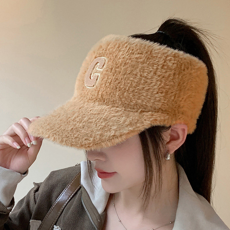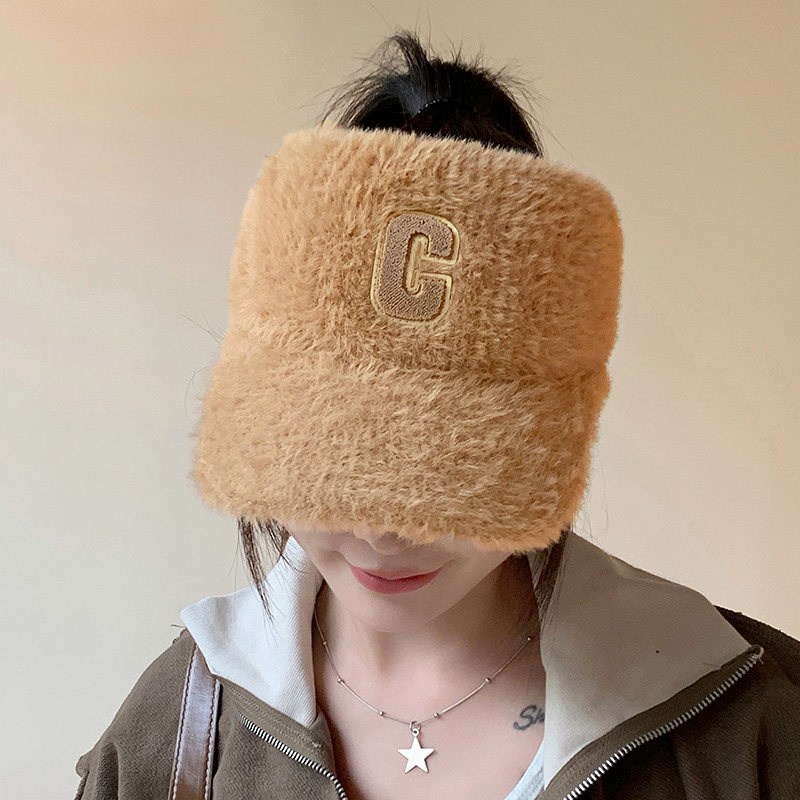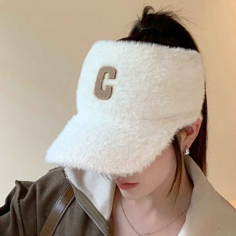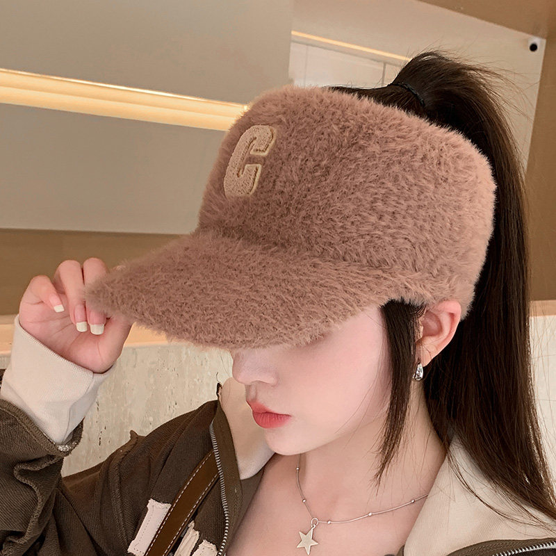 字母C时尚毛绒空顶帽子秋冬季女款简约运动鸭舌帽可扎马尾棒球帽