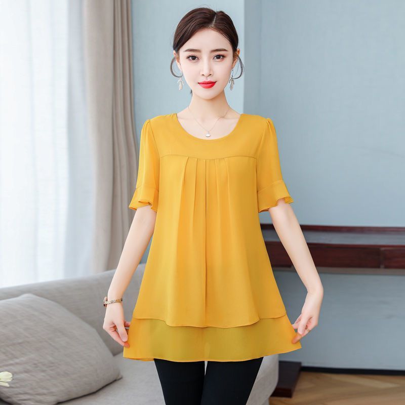 胖MM夏季大码女装宽松洋气雪纺衫遮肚子显瘦短袖T恤中年妈妈上衣