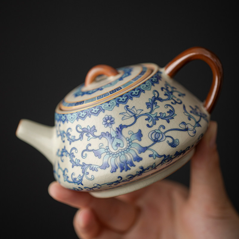 米黄汝窑青花西施壶茶壶茶杯单壶开片可养泡茶器陶瓷功夫茶具茶碗