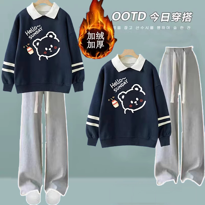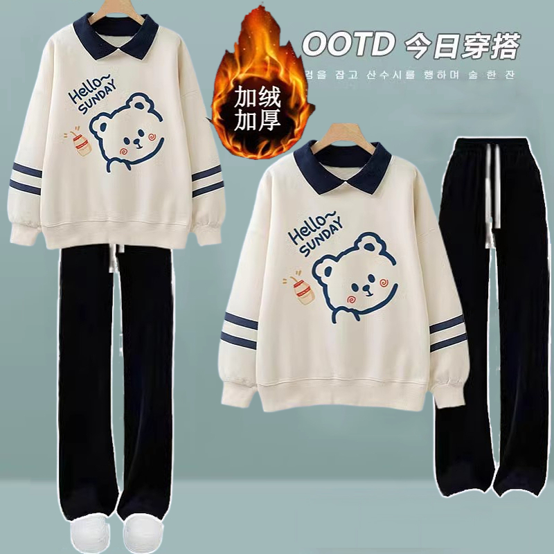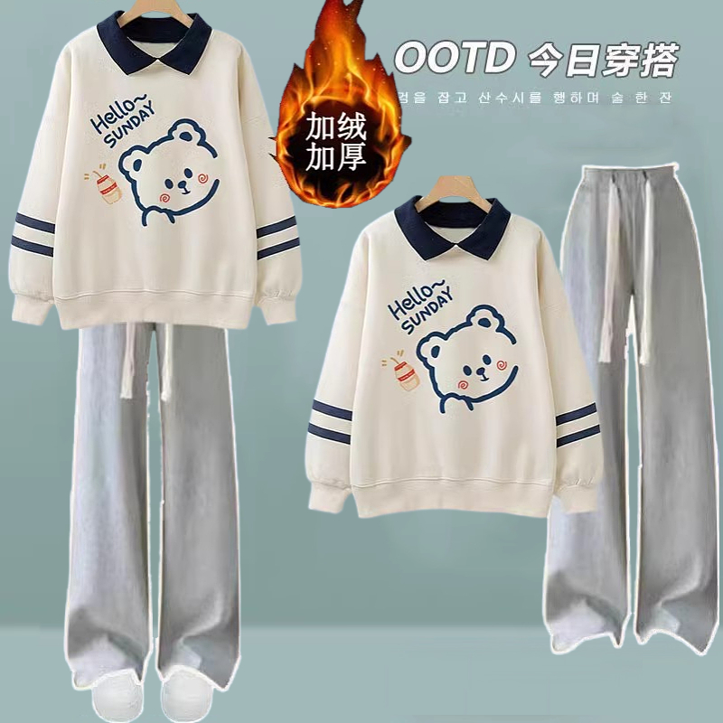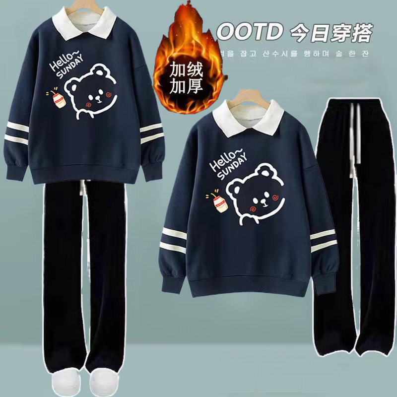 初中生少女秋冬季套装2025新款中大童POLO领卫衣阔腿裤加绒两件套