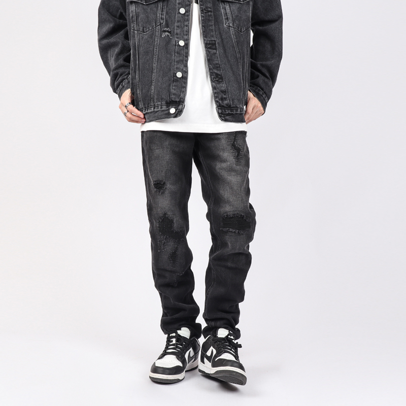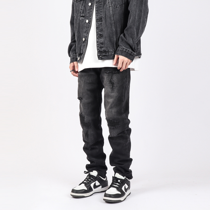 Z POCKET美式高街水洗直筒修身小脚黑色破洞牛仔裤潮牌男女裤子