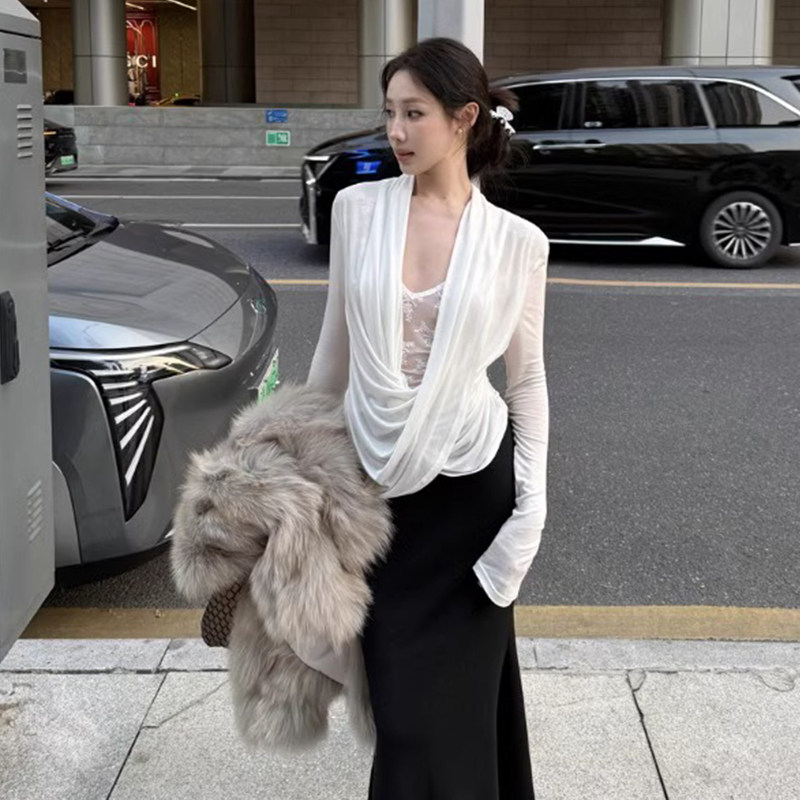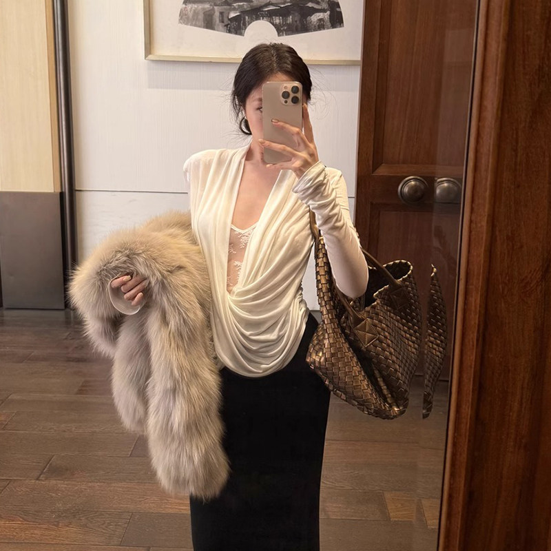 蕾丝拼接假两件荡领长袖T恤女早春修身设计感辣妹性感上衣打底衫