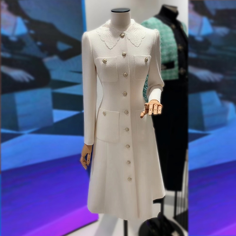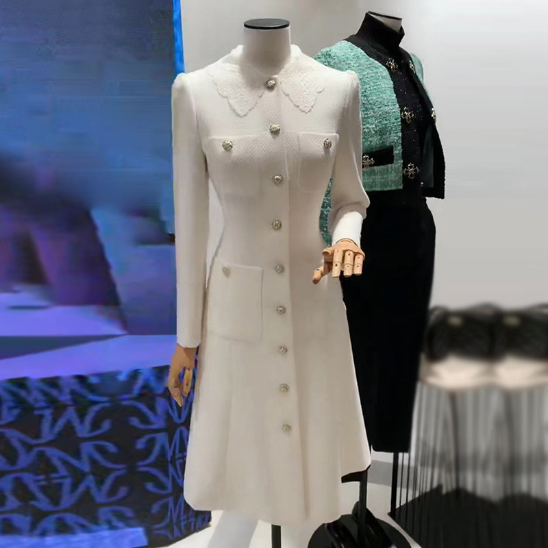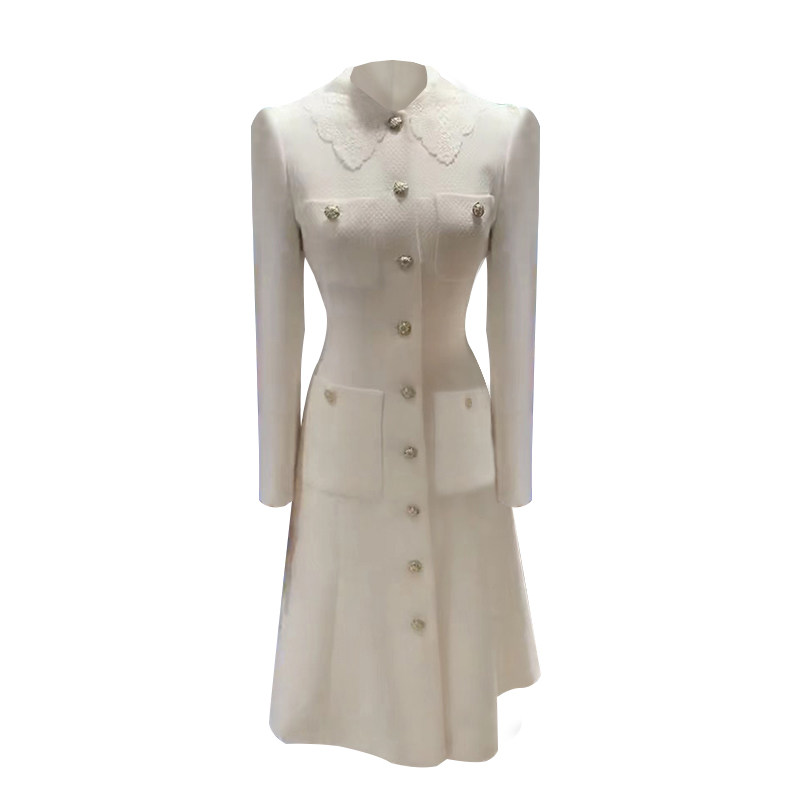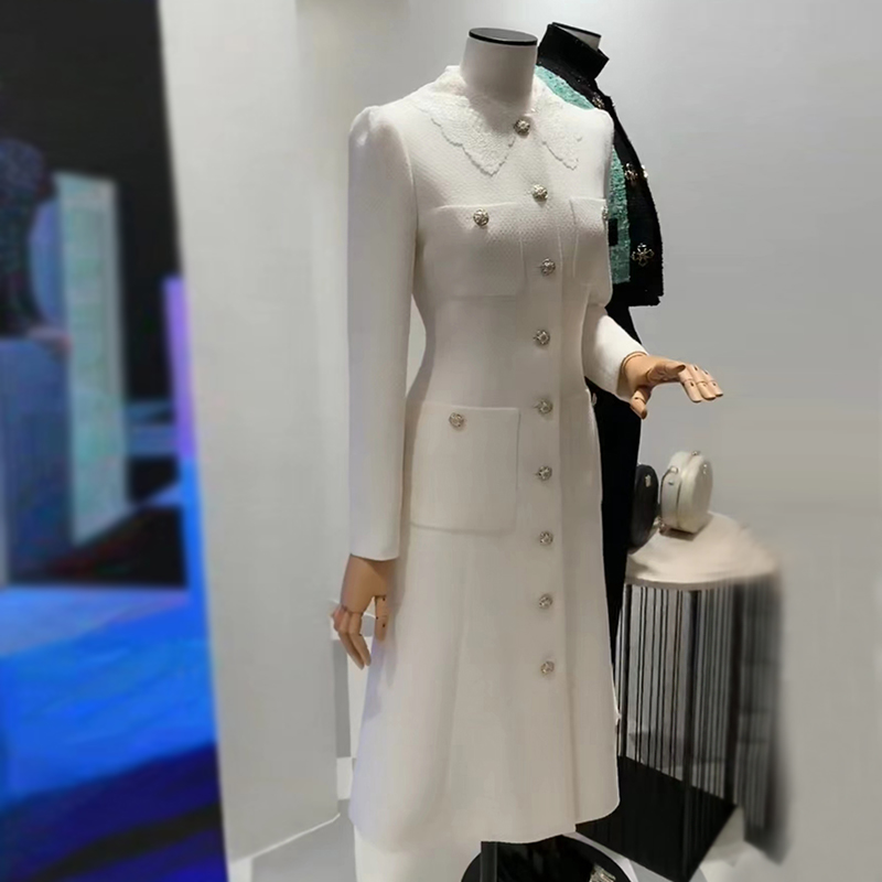 2025春秋新款韩版长袖打底裙蕾丝领A字中长款小香风白色连衣裙女