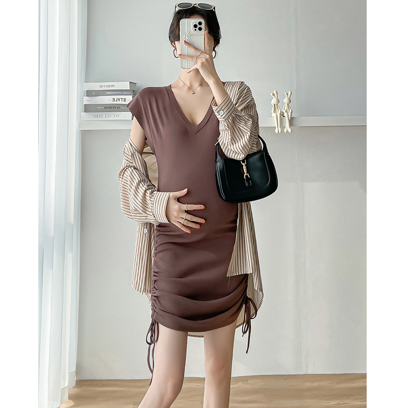 孕妇连衣裙夏装高级感抽绳弹力紧身裙2023新款QV领显瘦辣妈裙子女