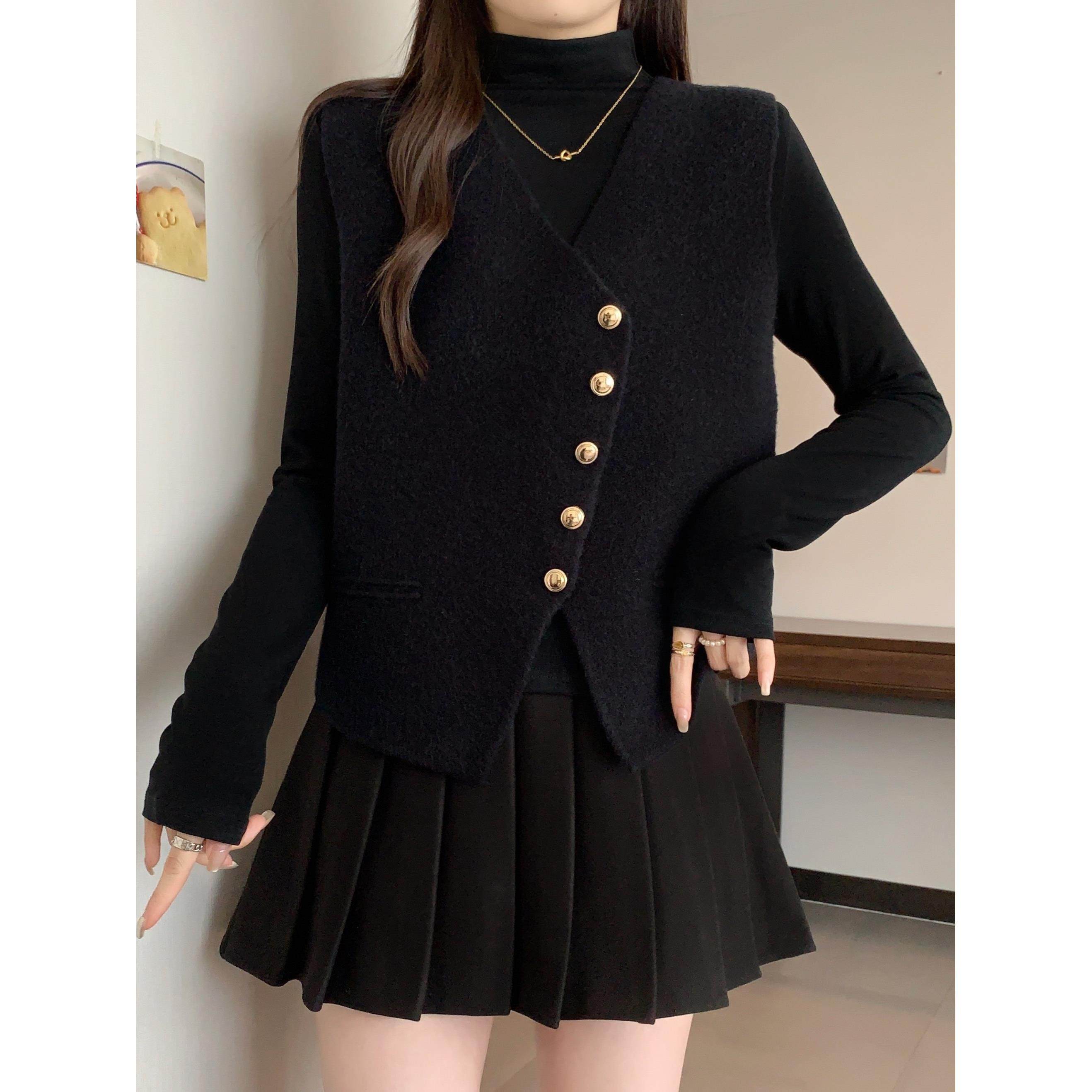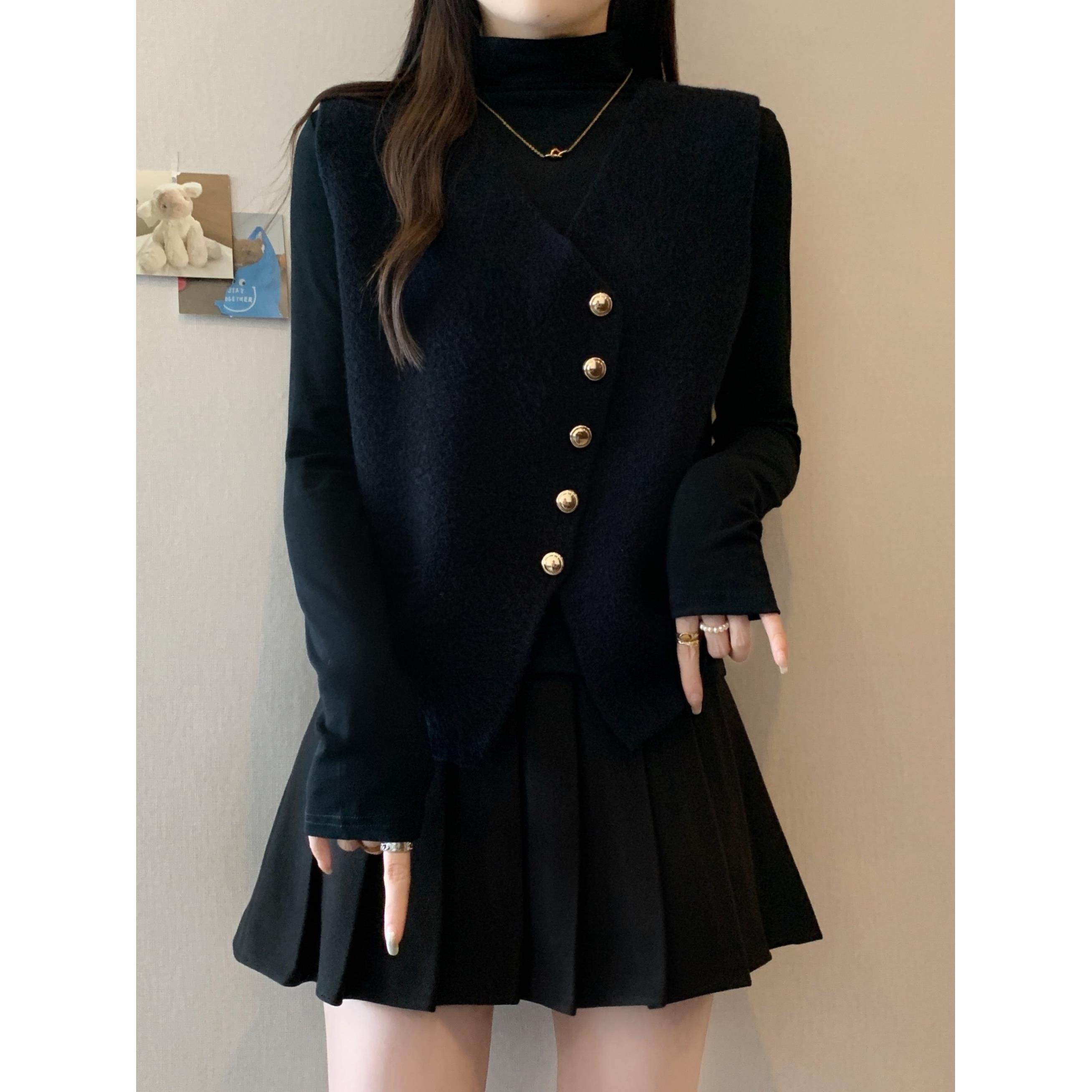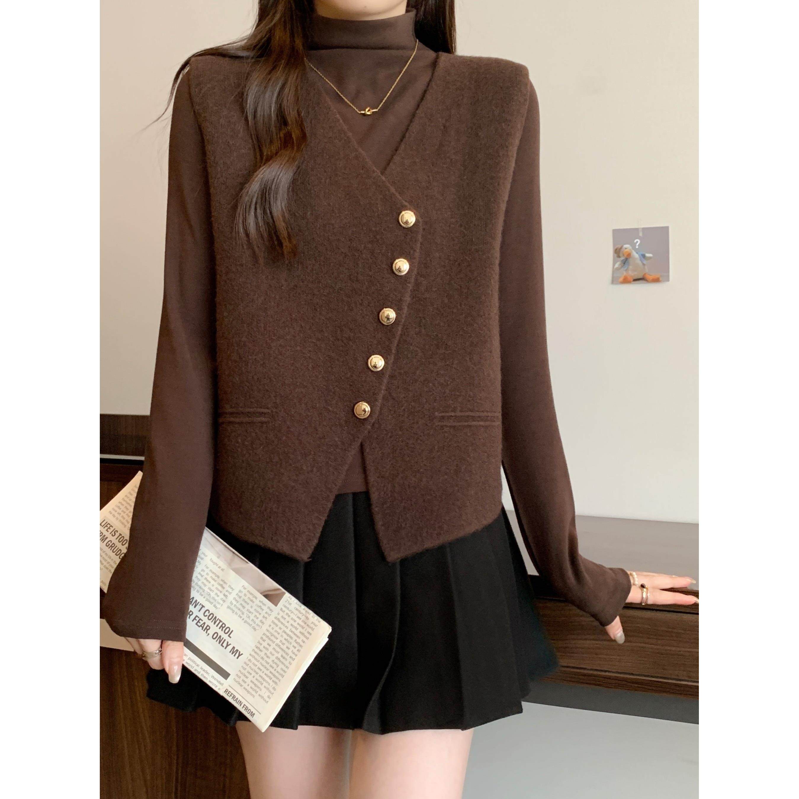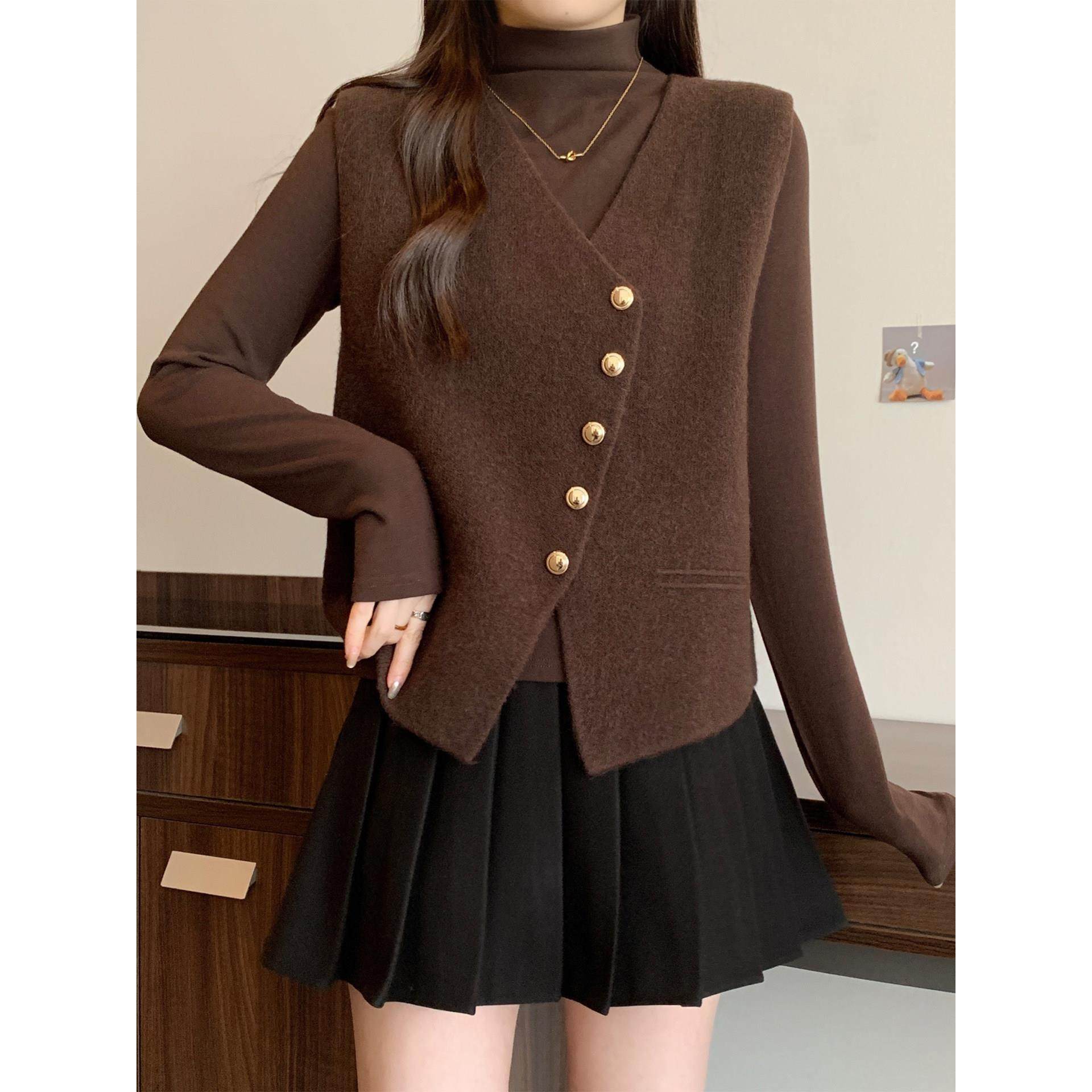 大码宽松半高领打底衫马甲两件套女秋冬胖mm显瘦咖色毛衣套装上衣