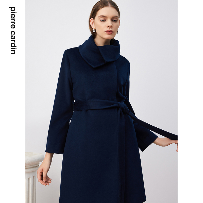 【皮尔卡丹女装】藏蓝色中长款毛呢外套时尚简约大衣【专柜正品】