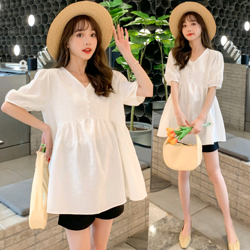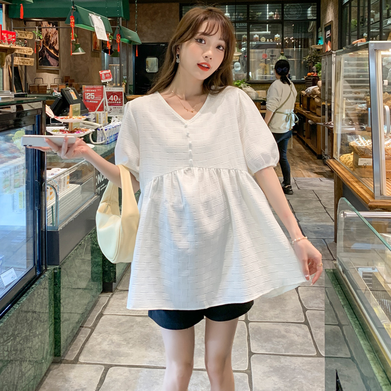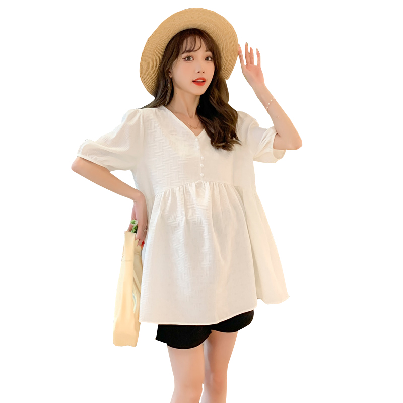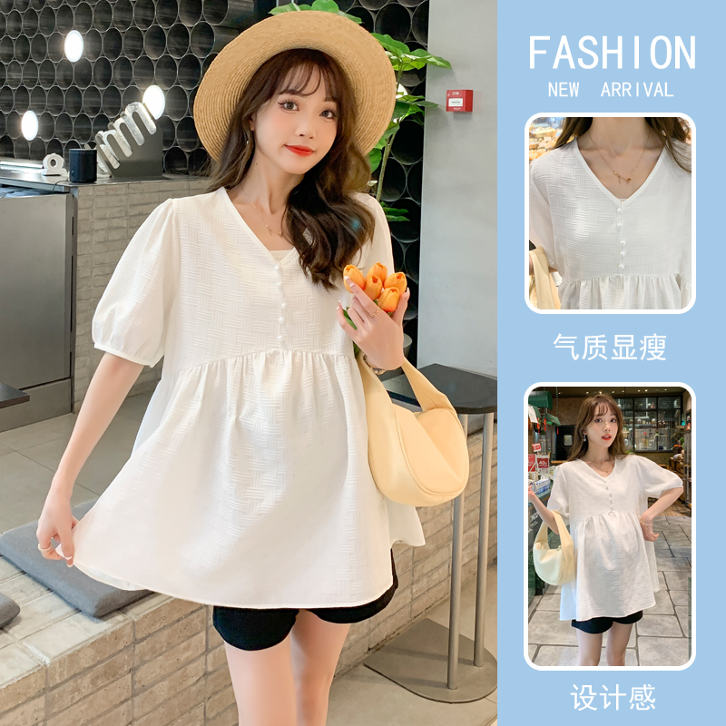 孕妇上衣夏装时尚v领娃娃衫遮肚子套装夏款宽松短R裤X子夏季两件