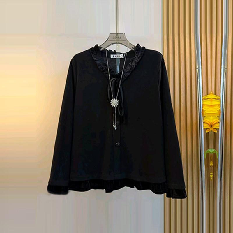 加肥大码女装V领长袖上衣胖妹妹黑色显瘦宽松荷叶边裤脚阔腿裤子