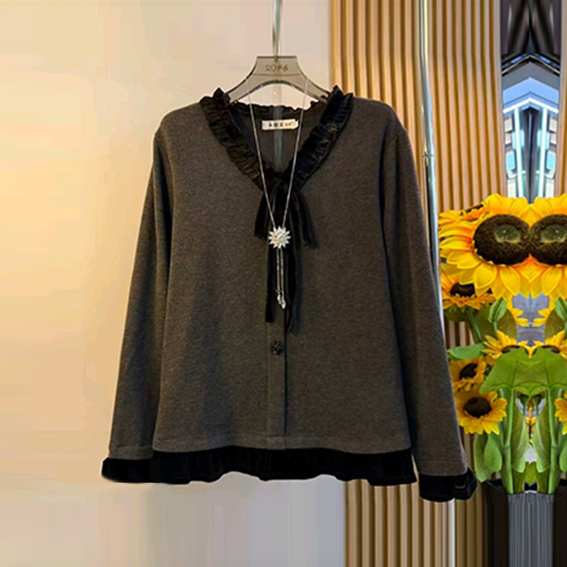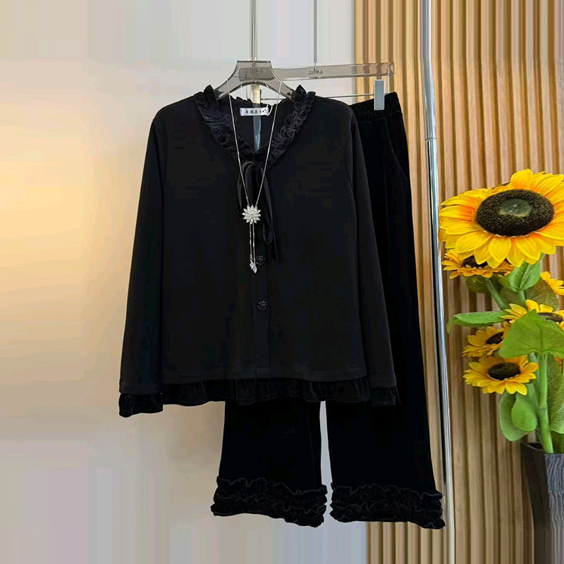荷叶边裤脚阔腿裤子V领长袖上衣