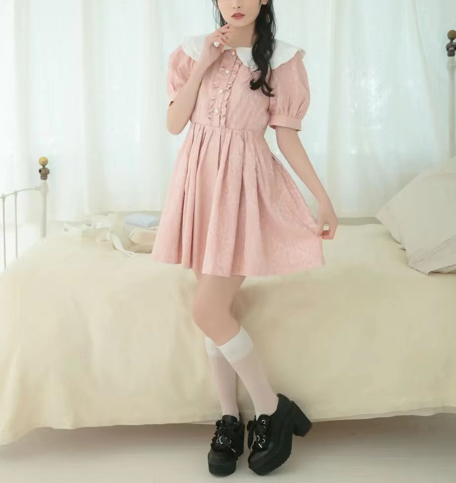 日单honeycinnamon 原单可爱甜美单排扣褶皱显瘦暗花娃娃领连衣裙