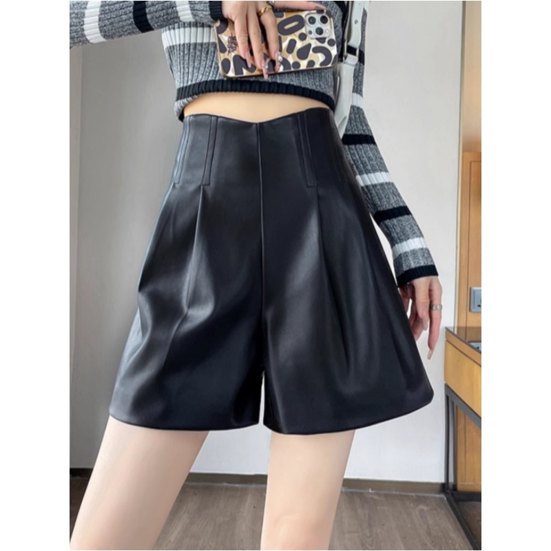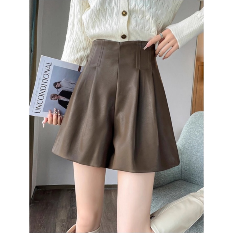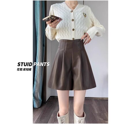 咖色pu小皮裤短裤女秋冬2024新款高腰a字阔腿小个子外穿打底靴裤
