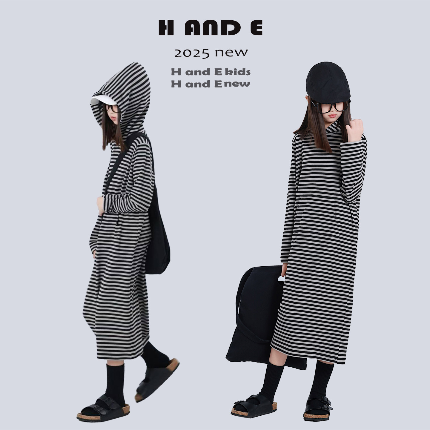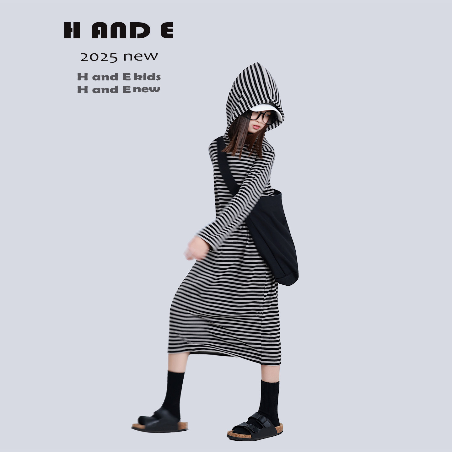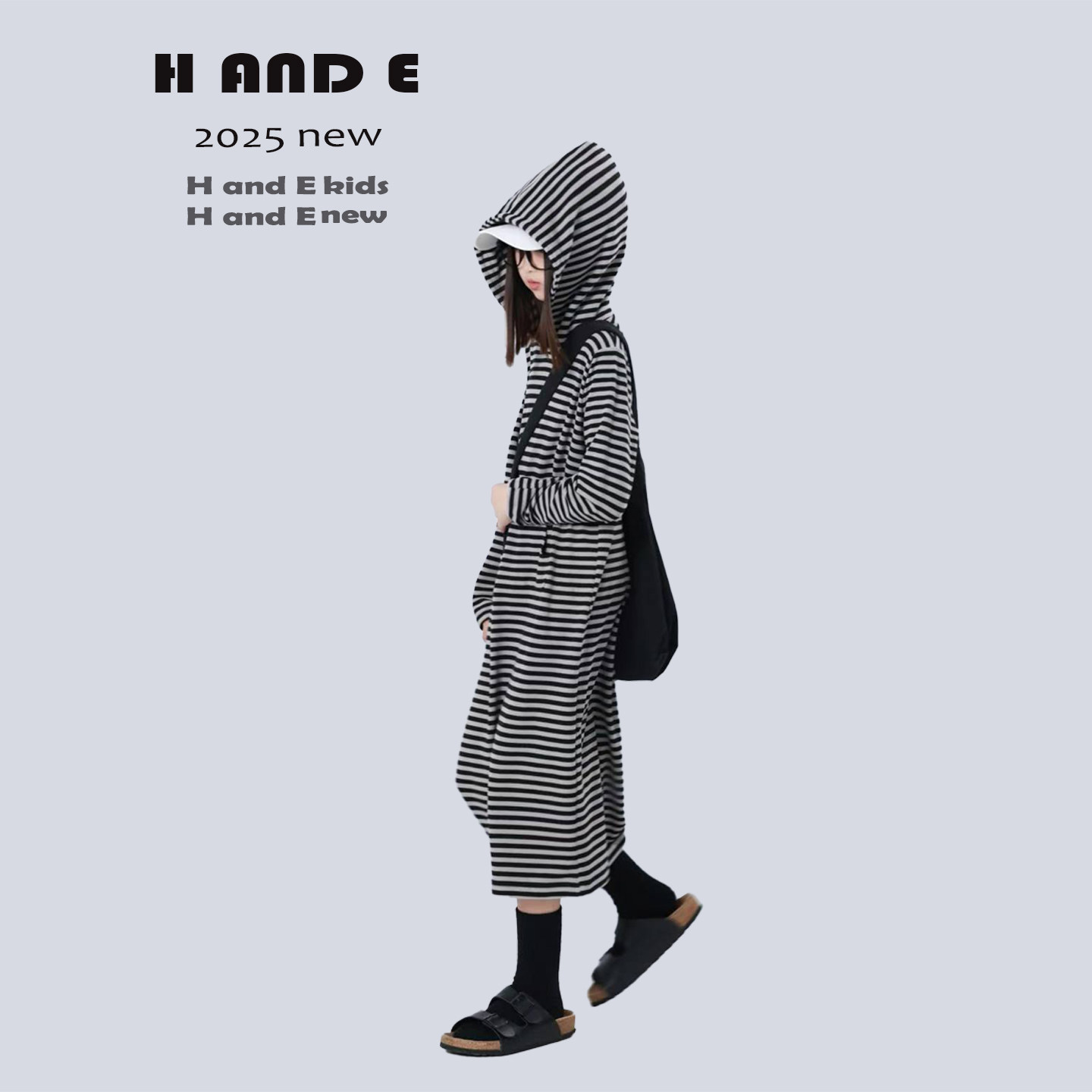 H AND E 原创童装2026春季灰黑条纹连帽长袖中长款卫衣裙女童亲子