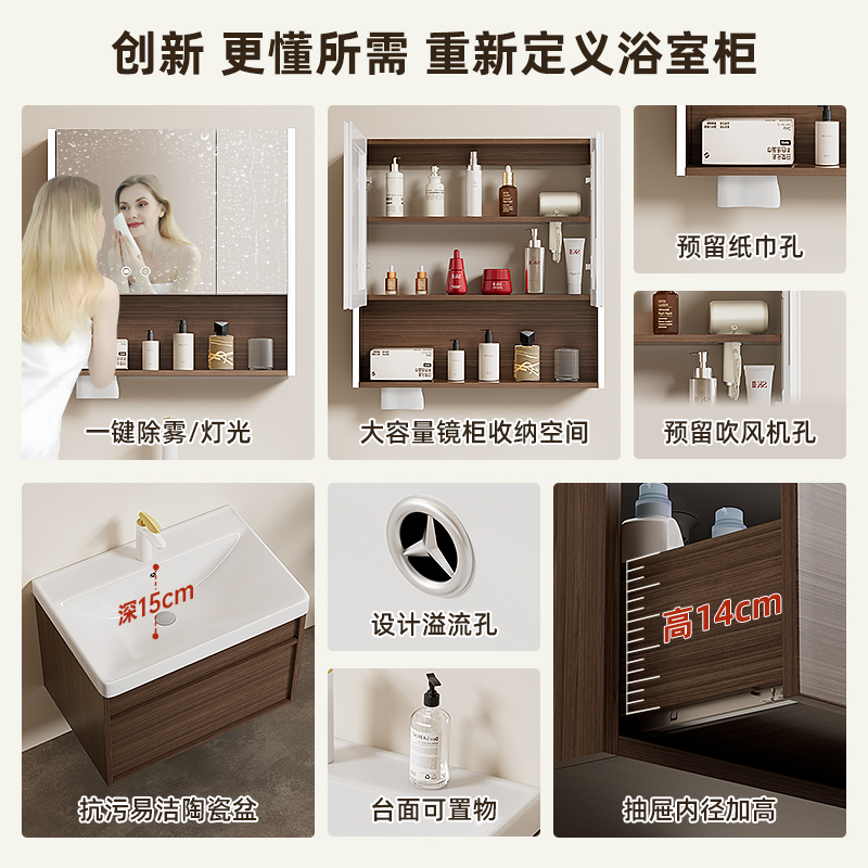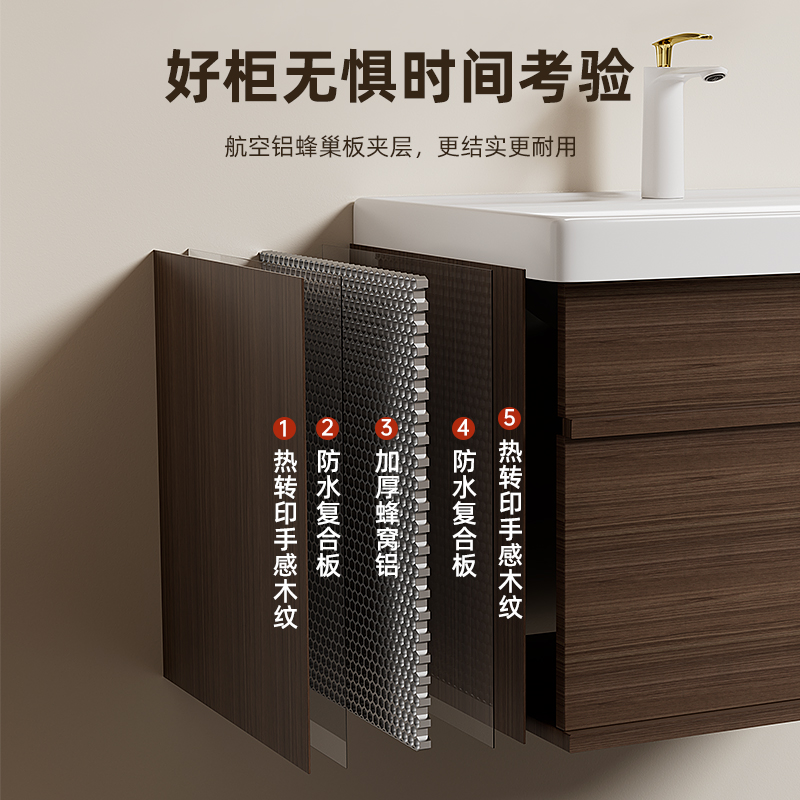胡桃木防水防潮加厚蜂窝铝挂墙浴室柜组合小户型卫生间陶瓷洗手盆