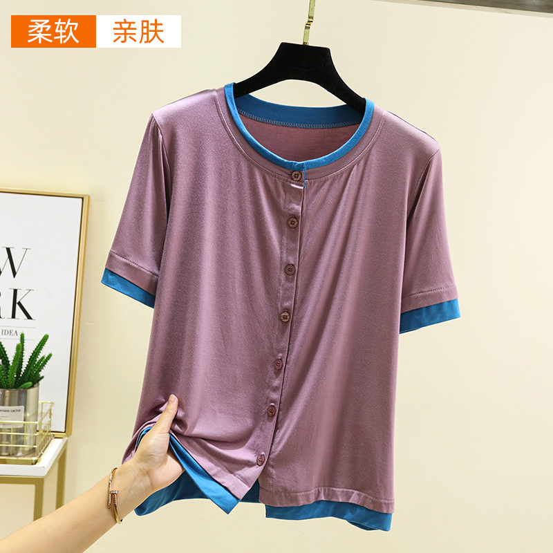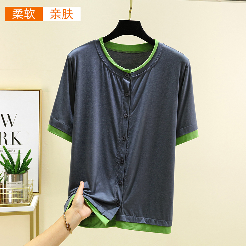 莫代尔圆领系扣上衣夏季休闲薄款短袖开衫女大码宽松拼接针织T恤