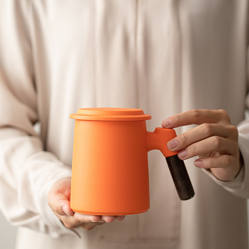 陶瓷马克杯咖啡杯勺子橙色办公杯带手柄小众设计感水杯可定制logo