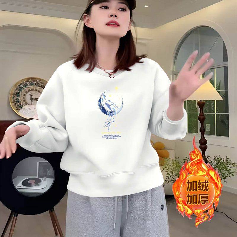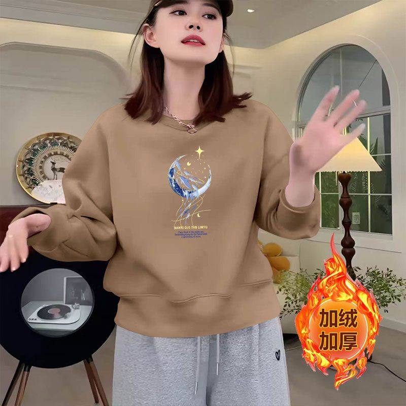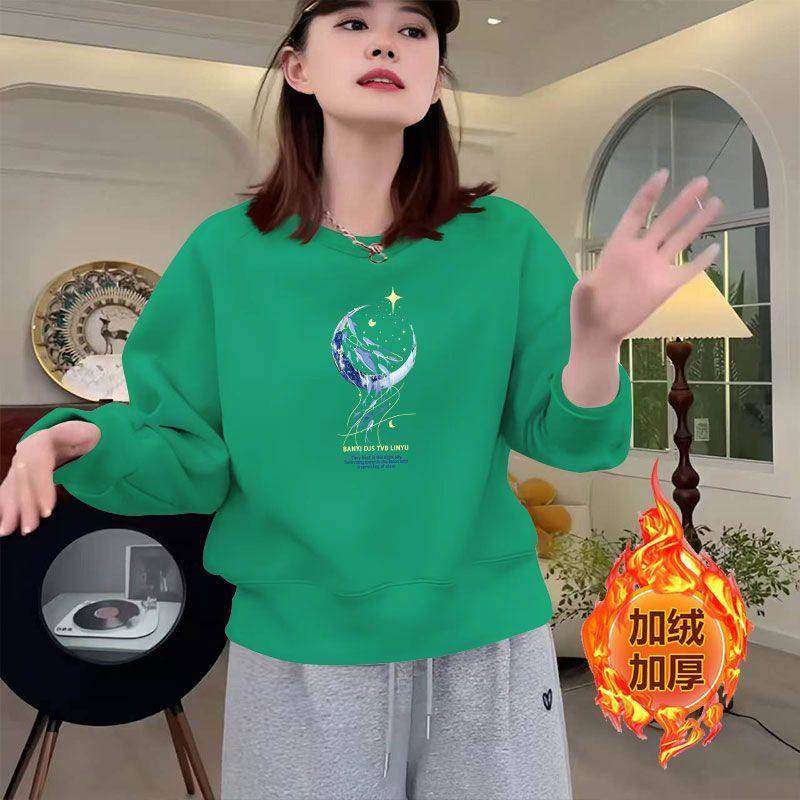 秋冬加绒加厚新款纯棉长袖百搭卫衣女圆领洋气短款小个子大码上衣