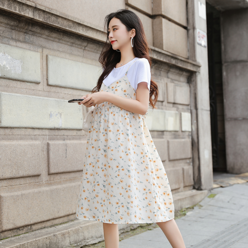 吊带裙孕妇夏装小个子雪纺碎花裙假两件套L装连衣裙女纯棉大码裙